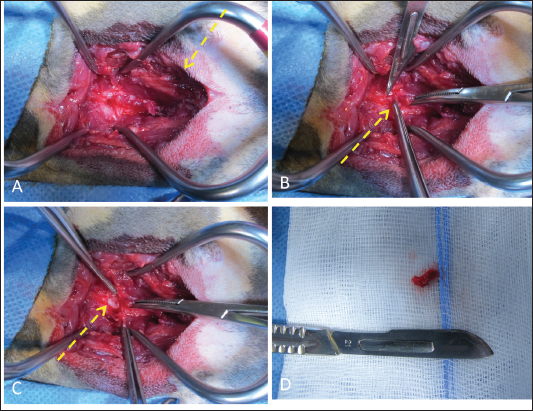 Fig. 4. Surgical approach to vertebral fracture of C4 through a dorsal cervical approach. (A) Once the surgical access was performed, the epaxial muscles showed gross evidence of blunt trauma (yellow dotted arrow). (B) The fourth and fifth cervical vertebrae were skeletonized to evidence the bone fracture. Then, the caudal fragment was grabbed, elevated, and removed, cutting the flavum ligament (note the bone fragment between the forceps, yellow dotted arrow). (C) The uncompressed spinal cord was visualized after the bone fragment was removed (yellow dotted arrow). At the end of the procedure, the cat gradually and quietly awakened. Venous blood gas analysis revealed mild respiratory acidosis and mild hypernatremia, consistent with the results of the anesthetic procedure (Table 1). The cat was monitored in the intensive care unit, and hypotonic fluid therapy was started at 2 ml/kg/h IV, together with analgesic therapy with methadone at 0.1 mg/kg IV every 4 hours, and antiemetic therapy with maropitant at 1 mg/kg IV every 24 hours. Antibiotic therapy with 20 mg/kg IV ampicillin-sulbactam every 8 hours was continued. Almost 12 hours after surgery, the cat positioned itself in sternal recumbency, began eating spontaneously, and maintained spontaneous urination. Over the following days, the cat showed progressive clinical improvement to the point of resumption of ambulation. A complete blood count revealed mild normocytic normochromic anemia, moderate thrombocytopenia, and worsening of neutrophilic leukocytosis (Table 2). Biochemical analysis revealed a decrease in hepatic and muscle damage markers and hypoproteinemia, consistent with trauma sequelae (Table 2). Analgesia was discontinued 72 hours postoperatively, and the cat was discharged with a broad-spectrum antibiotic therapy with amoxicillin and clavulanic acid 20 mg/kg orally every 12 hours for another 5 days, with the recommendation of cage rest for 1 month, followed by appropriate physiotherapy. Given the progressive clinical improvement and the absence of marked postoperative deficits, physiotherapy was declined. After discharge, the cat showed further progressive improvement up to near-normal ambulation at the clinical follow-up 14 days after surgery, despite presenting with residual mild proprioceptive ataxia in the thoracic and pelvic limbs. Breathing patterns were unremarkable, neck manipulation was painless, and the surgical wound had completely healed. Three months after surgery, the cat regained a completely normal gait and returned to its normal lifestyle. DiscussionThis is the first case report describing the clinical presentation and surgical management of a C4 vertebral fracture in a cat. A cascade of pathological processes occurs following traumatic spinal cord injury, including hypoperfusion, rapid changes in intracellular ion concentrations, and the release of reactive oxygen species (Olby, 2010). Additionally, progressive demyelination and worsening of neuronal injury can occur in cases of sustained spinal cord compression (Jeffery, 2010). This mechanism leads to the exacerbation of spinal cord damage and should be interrupted as soon as possible (Olby, 2010). Therefore, the primary goal of surgical intervention is to preserve residual neurological function by decompressing the spinal cord and creating an environment in which the damaged neuronal tissue can heal (Jeffery, 2010). To date, the surgical treatment of vertebral fractures, particularly cervical ones, remains controversial (Hawthorne et al., 1999). This debate stems from the high perioperative mortality rates observed; however, there is increasing evidence suggesting that unstable or compressive fractures would benefit more from surgical treatment than from conservative management (Horlein, 1978; Hawthorne et al., 1999; Olby, 2010; Orgonikova et al., 2021). In this case, surgical intervention effectively relieved the spinal cord compression and prevented secondary neuronal injury, resulting in a rapid and favorable outcome. Surgical treatment of cervical spine fractures generally involves the use of monocortical or bicortical screws and polymethylmethacrylate or locking plates (Hawthorne et al., 1999; Jeffery, 2010; Orgonikova et al., 2021). However, in this case, the fracture consisted of an almost complete fragment of the dorsal lamina, without involvement of the articular processes; therefore, surgical stabilization was deemed unnecessary. Removal of the compressive bone fragment did not result in instability, as the spinal stability was maintained by the vertebral body, articular processes, and intervertebral disc. Therefore, the procedure was comparable to a dorsal laminectomy. The initial radiographic study failed to detect the vertebral fracture in the case reported herein. This is consistent with the known limitations of radiology, which, despite its widespread use, has only moderate sensitivity for the diagnosis of vertebral luxation and fractures and is prone to several artifacts (Kinns et al., 2006; Eminaga et al., 2011). Given these limitations and the strong clinical suspicion of a cervical vertebral fracture or luxation, CT was recommended, confirming a C4 vertebral fracture. Due to its 100% sensitivity and detailed definition of vertebral bony structure, CT is the gold standard for the diagnosis of vertebral fractures (Kinns et al., 2006; Da Costa and Samii, 2010; Orgonikova et al., 2021). In this case, the cat presented with concurrent airway trauma, a finding not uncommon in feline polytraumatized patients with vertebral fractures, where associated injuries are reported in up to 83% of cases (Hawthorne et al., 1999; Bruce et al., 2008; Bali et al., 2009). Although rare in cats, tracheal rupture is a potentially life-threatening condition that may arise from both traumatic and iatrogenic events (Hardie et al., 1999; Bhandal and Alan, 2007). It most commonly affects the extrathoracic portion of the trachea, particularly at the junctions betwee