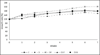 Fig. 2. Effect of black oncom substitution on the growth rate (%) of rats fed a vitamin B6-deficient diet for 7 weeks. Description: C: control; D: vitamin B6 deficiency ≤0.6 mg/kg feed; DP: vitamin B6 deficiency + pyridoxine hydrochloride 7 mg/kg feed; DOF: vitamin B6 deficiency + black oncom flour (15.05 g/kg feed); DOB: vitamin B6 deficiency + black oncom biscuits (76.89 g/kg feed). Validation of the vitamin B6 status analysisValidation of vitamin B6 status analysis covered the precision (% RSD), % recovery, and LOD. The value of RSD was < 6% that means the validation method showed received precision (Aoac International, 2016). Moreover, the accuracy of vitamin B6 status was exhibited as a percentage of recovery in the range of 88.7–107.4. It complied with the AOAC that the acceptable percentage recovery was 80–110 (AOAC International, 2016). Furthermore, the intra-day LOD of the method was 0.9 (µg/ml) for PLP and 3.6 (µg/ml) for Hcy. It showed the lowest concentration of PLP and Hcy detected by the instrument. This validation was valid, accurate, and can measure PLP and Hcy levels in the rat plasma and strengthen the analysis of vitamin B6 status. Vitamin B6 status (plasma PLP and Hcy levels)Vitamin B6 status was determined from the PLP levels in the plasma (Fig. 3). The ANOVA results showed that plasma PLP levels were not significantly different (p > 0.05) between the groups before and after 7 weeks of intervention. However, the PLP values of the C, D, and DP groups after intervention tended to be lower than those in the other groups (DOF and DOB). The paired t-test results before and after the intervention showed a fairly large decrease in the plasma PLP levels of the vitamin B6-deficient group (D) (p > 0.05), and the provision of a vitamin B6-deficient diet substituted with black oncom did not affect the plasma PLP levels (p > 0.05). Nevertheless, the PLP levels of all groups still met the normal criteria of vitamin B6 status. It indicated that a vitamin B6-deficient diet can reduce the PLP level of rats. Meanwhile, the reduction in the PLP of the control and pyridoxine-substituted diets happened because of some factors. The administration of vitamin B6 in the form of pyridoxine can increase its excretion in urine and increase vitamin B6 requirement based on body condition, but there was no further analysis of that in this study. On the other hand, DOF tends to increase the PLP level higher than DOB, which might be due to the availability of fermented peanut meal than derivative products in the form of biscuits, but this has not been covered in this study. Despite this, black oncom substitutes had the potential to increase the PLP level of rats fed a vitamin B6-deficient diet due to the vitamin B6 content of black oncom flour and black oncom biscuits.