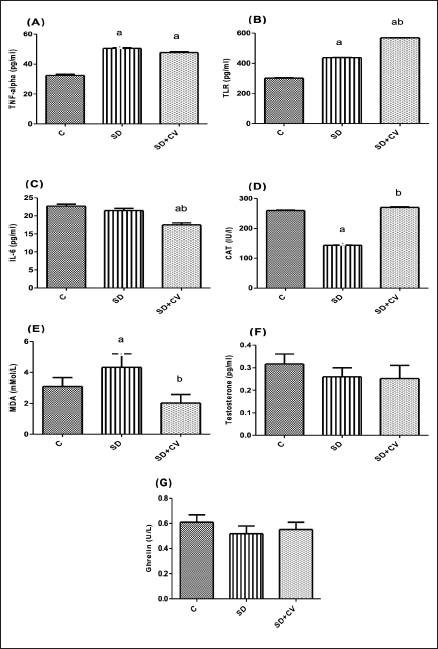 Fig. 1. (A–G): Effect of chlorella on serum levels of TNF- (A), TLR (B), IL-6 (C), CAT (D), MDA (E), testosterone (F), and ghrelin (G). All data are presented as mean ± SEM (n=6). aVersus normal control diet rats, at p < 0.05. bVersus SD rats, at p < 0.05. One-way ANOVA was used, followed by the Tukey–Kramer multiple comparison test.