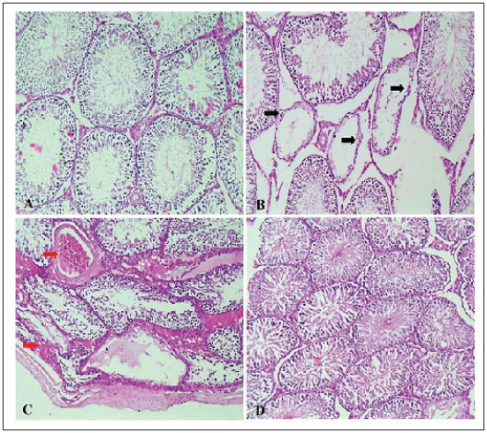 Fig. 3. (A–D): Photomicrograph of testicular tissue sections stained with H&E (×100) showing normal seminiferous tubules of regular contour, spermatogenesis, and narrow intertubular spaces with Leydig cells (A) in rats of the ND group. Rats that received a SD showed severe vacuolar degeneration and necrosis of spermatogonial cells as well as desquamation of spermatogonial cells lining seminiferous tubules (black arrows) with subcapsular congestion (red arrows) (C). Testis of (SD + CV) treated rats showing mild testicular degeneration associated with marked restoration of normal histologic architecture (D). Table 4. Semen picture of rats given Chlorella vulgaris.