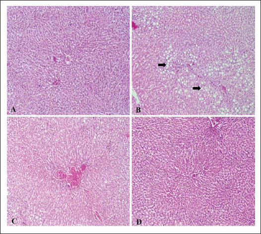 Fig. 4. (A–D): Photomicrograph of liver tissue sections stained with H&E (×100) showing no histopathological changes in the hepatic parenchyma (A) in the control and ND groups. Rats that received a SD showed severe vacuolar degeneration of hepatocytes and marked micro- and macrovasicular steatosis in all three zones (black arrows) (B), associated with severe hepatic congestion (C). Liver of (SD + CV) treated rats showing mild vacuolar degeneration associated with marked restoration of normal histologic architecture (D).