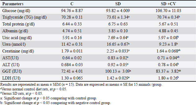 Fig. 5. (A–D): Photomicrograph of kidney tissue sections stained with H&E (×100) showing no histopathological changes in the kidney parenchyma (A) in the control and ND groups. Rats that received a SD showed severe atrophy of the glomerular tuft (black arrows) associated with severe congestion of the interstitial blood vessels (red arrows) (B, C). Kidneys of (SD + CV) treated rats showing mild vacuolar degeneration associated with marked restoration of normal histologic architecture (D). Table 5. Changes in some biochemical parameters in different treatment groups.