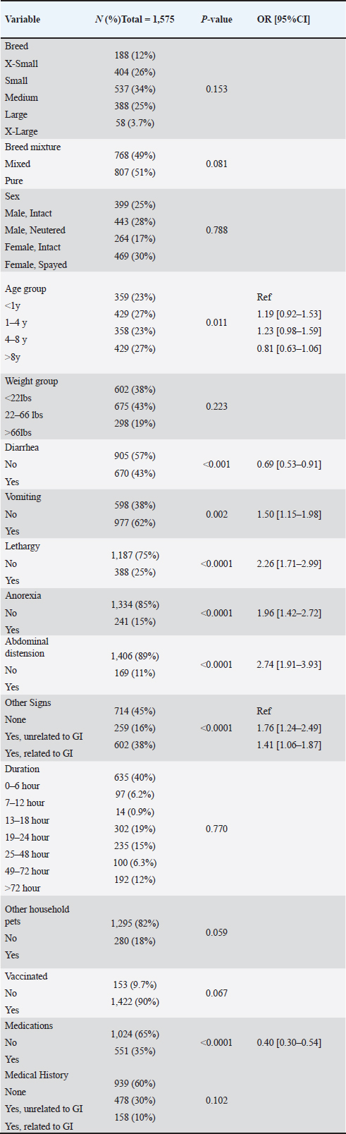 Factors associated with ER referralUnivariable analyses, based on the chi-square test, revealed that the following eight variables were associated with ER referral rate: age group (p < 0.011), diarrhea (p < 0.001), vomiting (p < 0.002), lethargy (p < 0.0001), anorexia (p < 0.0001), abdominal distention (p < 0.0001), the presence of other clinical signs (p < 0.0001), and medications (p < 0.0001). With the exception of age, diarrhea, and medications, the presence of a factor was associated with an increased risk of emergency facility referral. However, the presence of diarrhea or medications was associated with a decreased risk of emergency facility referral. When these eight variables were entered in a multivariable logistic regression model, subject to backward variable selection, seven of these variables (age group was eliminated) were independently and significantly associated with ER referral (Table 2): diarrhea (OR=0.69 [0.53–0.91], vomiting (OR=1.50, 95%CI=[1.15–1.98]), lethargy (OR=2.26 (1.71–2.99), anorexia (OR=1.96 [1,42–2.72]), abdominal distention (OR=2.74 [1.91–3.93]), the presence of other clinical signs (OR=1.76 [1.24–2.49] for signs unrelated to GI and OR=1.41 [1.06–1.87] for signs related to GI), and medications (OR=0.40 [0.30–0.54]) when compared to the reference category of “No” or “None.” Table 2. Results of multivariate logistic regression (OR and 95% CI) after selection of backward variables.