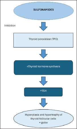 Fig. 1. Effect of sulfonamides on thyroid gland function. Sulfonamides inhibit thyroid peroxidase, resulting in reduced secretion of circulating thyroid hormones. The consequent decrease of negative feedback results in the compensatory stimulation of TSH release. Ultimately, hyperplasia and hypertrophy of thyroid follicular cells are induced, clinically manifesting as goiter. ConclusionAlthough hypothyroidism is one of the most common endocrine disorders in dogs, it continues to present a diagnostic challenge, primarily due to the frequent misinterpretation of clinical and laboratory findings. The overdiagnosis of this condition is a significantly greater clinical concern than the underdiagnosis. Unjustified treatment of dogs that are not truly hypothyroid can lead to unnecessary medication, potential side effects, and delayed identification of the actual underlying condition. Thyroid function tests and clinical signs in dogs treated with trimethoprim–sulfamethoxazole may be indistinguishable from those in dogs with spontaneous hypothyroidism. Therefore, it is essential to rule out drug-induced hypothyroidism before initiating levothyroxine therapy. For patients receiving prolonged trimethoprim–sulfamethoxazole treatment, healthcare providers should perform routine monitoring of thyroid function. AcknowledgmentsNone. Conflict of interestThe authors declare no conflict of interest. FundingThis study received no specific grant. Authors’ contributionsConcept – ALJ; Supervision – DČ; Data Collection and/or Processing – ALJ, DČ, DP; Analysis and/or Interpretation – ALJ, DČ; Literature Search – ALJ, DČ, DP; Writing Manuscript – ALJ; Critical Review – DČ, DP. Data availabilityAll data supporting this study’s findings are available within the manuscript. ReferencesAlexander, D., Cobucci, G.C., Da Motta, C.C., Cid, G.C., Belizzi, L.S., De Jesus, A.C., Souza, H.J. and Peterson, M.E. 2025. Iatrogenic primary hypothyroidism associated with sulfamethoxazole-trimethoprim treatment. J. Vet. Intern. Med. 39(2), e70045; doi:10.1111/jvim.70045 Anyogu, D.C., Shoyinka, V.S. and Ihedioha, J.I. 2017. Effects of prolonged treatment with co-trimoxazole on the thyroid gland, liver, and epididymal sperm reserve in dogs. Clin. Med. Insights. Pathol. 10, 1179555717742881; doi:10.1177/1179555717742881 Bolton, T.A. and Panciera, D.L. 2023. Influence of medications on thyroid function in dogs: an update. J. Vet. Intern. Med. 37(5), 1626–1640; doi:10.1111/jvim.16823 Brenner, K., Harkin, K. and Schermerhorn, T. 2009. Iatrogenic, sulfonamide-induced hypothyroid crisis in a Labrador Retriever. Aust. Vet. J. 87(12), 503–505; doi:10.1111/j.1751-0813.2009.00521.x Cohen, H.N., Pearson, D.W.M., Thomson, J.A., Ratcliffe, W.A. and Beastall, G.H. 1981. Trimetophrim and thyroid function. Lancet 317(8221), 676–677; doi:10.1016/S0140-6736(81)91606-8 Dixon, M., Reid, S.W.J. and Mooney, C.T. 1999. Epidemiological, clinical, haematological and biochemical characteristics of canine hypothyroidism. Vet. Rec. 23(17), 481–487; doi:10.1136/vr.145.17.481 Frank, L.A., Hnilica, K.A., May, E.R., Sargent, S.J. and Davis, J.A. 2005. Effects of sulfamethoxazole-trimethoprim on thyroid function in dogs. Am. J. Vet. Res. 66(2), 256–259; doi:10.2460/ajvr.2005.66.256 Gulikers , K.P. and Panciera, D.L. 2002. Influence of various medications on canine thyroid function. Compend. Contin. Educ. Pract. Vet. 24(7), 511–523 Halman, C., Gavaghan, B. and Korman, R. 2024. Clinical hypothyroidism in a cat associated with sulfonamide administration for the management of intracranial nocardiosis. Austral. Vet. J. 102(12), 633–637; doi:10.1111/avj.13368 Mooney, C.T., Ettinger, S.J., Feldman, E.C. and Côté, E. 2017. Canine hypothyroidism. In Textbook of veterinary internal medicine: diseases of the dog and the cat. Eds., Ettinger, S.J., Feldman, E.C. and Côté, E. St. Louis, MO: Elsevier. Nelson, R.W. 2014. Disorders of the thyroid gland. In Small animal internal medicine. Eds., Nelson, R.W. and Couto, C.G. St. Louis, MP: Mosby, Elsevier. Oberbauer, A.M., Belanger, J.M., Petroff, B.K., Brown, D.E., Wolfe, C.R. and Famula, T.R. 2025. Repeated thyroid function evaluations in the dog: a retrospective study of 8,309 dogs. Front. Vet. Sci. 12, 1653398; doi:10.3389/fvets.2025.1653398 Panciera, D.L. 1994. Hypothyroidism in dogs: 66 cases (1987-1992). J. Am. Vet. Med. Assoc. 204(5), 761–767. Papich, M.G. 2018. Sulfonamides and potentiated sulfonamides. In Veterinary pharmacology and therapeutics. Eds., Papich, M.G. and Riviere, J.E. Hoboken, NJ: Wiley-Blackwell. Scott-Moncrieff, J., Feldman, E.C., Nelson, R.W., Reusch, C.E., Scott-Moncrieff, J.C., Canine, F. and Endocrinology. 2015. Hypothyroidism. In Canine and feline endocrinology. Eds., Feldman, E.C., Nelson, R.W., Reusch, C.E. and Scott-Moncrieff, J.C. St. Louis, MO: Elsevier Saunders. Scott-Moncrieff, J.C. 2007. Clinical signs and concurrent diseases of hypothyroidism in dogs and cats. Vet. Clin. North Am. Small Anim. Pract. 37(4), 709–722; doi:10.1016/j.cvsm.2007.03.003 Seelig, D.M., Whittemore, J.C., Lappin, M.R., Myers, A.M. and Avery, P.R. 2008. Goitrous hypothyroidism associated with treatment with trimethoprim-sulfamethoxazole in a young dog. J. Am. Vet. Med. Assoc. 232(8), 1181–1185; doi:10.2460/javma.232.8.1181 Travail, V., Fernandez Sanchez, C., Costo, J.M., Valentine, N., Conroy, M., Lee, V., Bouziopoulos, D., Bateman, K., Gatehouse, E., Cruzado-Perez, J., Pollard, D., Lamb, V., Juvet, F. and Kelly, D. 2024. Assessment of the likelihood of hypothyroidism in dogs diagnosed with and treated for hypothyroidism at primary care practices: 102 cases (2016-2021). J. Vet. Intern. Med. 38(2), 931–941; doi:10.1111/jvim.16993 WSAVA Global Nutrition Committee. 2020. Body condition score. Toronto, ON, Canada: World Small Animal Veterinary Association. Available via https://wsava.org/wp-content/uploads/2020/01/Body-Condition-Score-Dog.pdf (Accessed 11 June 2025). | ||