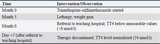 ABSTRACTBackground: Hypothyroidism is a common endocrine disorder in dogs; however, drug-induced hypothyroidism is uncommon in humans and veterinary medicine. Sulfonamides are among the few antibiotics known to interfere with thyroid function. However, reports in dogs are rare and often underrecognized. Case Description: A 12-year-old male Bichon Frise presented with alopecia and a history of slowness and weakness, weight gain despite unchanged food intake, and poor coat quality. A palpable bilateral symmetrical mass was observed in the neck area on examination. The patient had been receiving trimethoprim–sulfamethoxazole therapy for several months. Laboratory testing revealed reduced total thyroxine (TT4), consistent with iatrogenic hypothyroidism secondary to prolonged sulfonamide administration. Following drug discontinuation, TT4 values normalized within 7 days, and the dog showed marked clinical improvement, which confirmed the suspected diagnosis. Conclusion: This case highlights the potential of prolonged sulfonamide therapy to induce reversible hypothyroidism in dogs. Clinicians should be aware of this adverse effect because early recognition and drug withdrawal can lead to rapid clinical and biochemical recovery. Keywords: Dog, Hypothyroidism, Trimethoprim–sulfamethoxazole. IntroductionHypothyroidism is a common endocrine disorder in dogs that occurs when the thyroid gland produces lower amounts of tri-iodothyronine (T3) and thyroxine (T4) hormones (Dixon et al., 1999; Mooney, 2017). The most common form of primary hypothyroidism is idiopathic atrophy of the thyroid gland or lymphocytic thyroiditis (Nelson, 2014), which usually occurs in medium- to large-sized, middle-aged dogs (Dixon et al., 1999). The common clinical signs of this condition include: weight gain despite a controlled diet, lethargy, and skin and coat problems. Less commonly, clinical signs of hypothyroidism involve neurologic, cardiovascular, ophthalmic, and reproductive abnormalities (Dixon et al., 1999; Scott-Moncrieff, 2007; Mooney, 2017). The diagnosis is based on a combination of clinical signs, blood analysis (complete blood count, serum biochemistry panel) in conjunction with a decreased serum T4 and free T4 (fT4), and an increased serum thyroid-stimulating hormone (TSH) concentration (Scott-Moncrieff et al., 2015). Although hypothyroidism is one of the most common endocrine disorders in dogs, it is also often over-diagnosed (Oberbauer et al., 2025). The overdiagnosis of hypothyroidism represents a significantly greater concern than its underdiagnosis (Dixon et al., 1999). Many nonthyroidal factors, including breed, age, gender, concurrent illness, and certain drugs, can significantly affect the results of hormone measurements (Travail et al., 2024). Some medications, such as sulfonamides, can cause clinical hypothyroidism, and microscopic or even macroscopic goiter can occur (Bolton and Panciera, 2023). This case report describes a dog with sulfonamide-induced goitrous hypothyroidism. Case DetailsA 12-year-old male Bichon Frise was examined in a private veterinary clinic 6 months ago due to suspicion of urinary infection. The dog urinated frequently, sometimes uncontrollably, and blood traces were observed several times. Microscopic examination of the urine confirmed a higher number of bacteria. An antibiogram for amoxicillin and clavulanic acid was performed, and after it showed sensitivity to the aforementioned antibiotic, therapy was initiated [Amoxicillin/Clavulanic acid (12.5 mg/kg, PO, q 12 hours)]. The antibiotic was changed due to poor tolerance. Trimethoprim-sulfamethoxazole was initiated without performing a urine culture [sulfamethoxazole/trimethoprim (30 mg/kg, PO, q 12 hours)]. Treatment has been continued for the next few months due to the lack of improvement in the patient’s condition. Apart from the abovementioned symptoms, the dog showed additional signs of illness in the form of slowness and weakness, its coat became thinner, and weight gain was also observed despite consuming the same amount of food for the next few months. At reevaluation, the dog was alert and responsive but showed signs of lethargy and thinner fur. Due to the suspicion of Cushing’s disease, an adrenocorticotropic hormone stimulation test was performed. The test was negative. Abdominal ultrasound examination revealed small uroliths and a cyst on the left kidney and several cystoliths. The right adrenal gland was enlarged, which is why pheochromocytoma was suspected, and the planned surgical procedure to remove uroliths was postponed. The dog was referred to the Clinic for Internal Diseases, Oncology, and Emergency Medicine of the University of Sarajevo – Veterinary Faculty for further investigation 6 months after the first examination due to the lack of visible improvement. At clinical examination, the patient was found to be responsive. According to the WSAVA recommendations (2013), the body condition score was 6/9. The body temperature, heart rate, and respiratory rate were within the reference ranges. The fur was diffusely thinned, and a bilateral symmetrical subcutaneous mass was palpated in the region of the larynx. The remaining physical examination was unremarkable. The history and clinical examination were followed by blood sampling from the cephalic vein into an IDEXX EDTA KE/1.3 microtube for complete blood count and an L-heparin LH/1.3 microtube for heparinized plasma biochemistry panel (Chem 17 CLIP), and electrolytes (Lyte 4 CLIP). A ProCyte® Hematology Analyzer (Idexx Laboratories Inc.) was used to perform a complete blood count, and a Catalyst One® Chemistry Analyzer (Idexx Laboratories Inc.) was used to analyze the biochemistry panel and electrolytes. The complete blood count showed microcytosis, low mean corpuscular hemoglobin and reticulocyte hemoglobin concentration, and mildly elevated plateletcrit values. The biochemistry profile revealed mildly elevated alanine transaminase and gamma