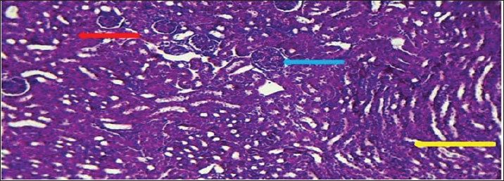 Fig. 6. Cross-hematological sections of kidney hamsters aged 2 weeks showing cortex parenchyma tissue (red arrow) and renal corpuscle (blue arrow) collected tubules (yellow arrow). 10x. H&E.