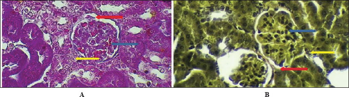 Fig. 9. Cross-histological section of the renal cortex in hamsters aged 3 weeks. Renal corpuscle (yellow arrow), junction of glomeruli capsule with proximal tubule (red arrow), and renal vein (blue arrow). A- 40x H&E stain, B- 40x. Masson’s trichrome stain.