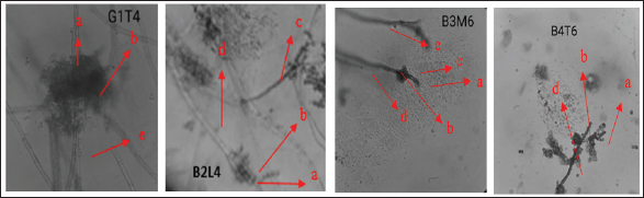 Fig. 1. Mollusc Association Fungi: a) conidia, b) vesicle, c) phialides, d) conidiophore, e) hyphae. Phytochemical test screening and thin-layer chromatographyPhytochemical screening was performed on extracts obtained from fungi associated with molluscs to qualitatively identify the types of secondary metabolites present. Using specific reagents, four fungal isolates, G1T4, B3M6, B4T6, and B2L4, were tested. The results revealed that the extract from isolate G1T4 contained flavonoids, alkaloids, and saponins. The B3M6 extract showed the presence of flavonoids and alkaloids. The B3M6 extract showed the presence of B4T6, and B2L4 extracts contained alkaloids only. To further analyze he bioactive compound, extracts from all four isolates were subjected to TLC. This technique was used to separate the compound fractions based on polarity. TLC plates were observed under ultraviolet (UV) light at 366 nm and 254 nm, and RF values were the results from the TLC analysis are presented in Figure 2.