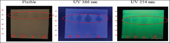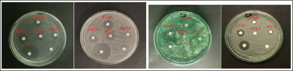 Fig. 2. TLC test results of mollusk association fungus isolate extract. Antibacterial and antifungal activity test against human pathogensSemi-quantitative antibacterial and antifungal assays were conducted to evaluate the bioactivity of fungal extracts derived from mollusc (Fig. 3). The extract from isolate G1T4 demonstrated strong antibacterial activity against Escherichia coli with a clear inhibition zone of 10.47 mm (±1.0). Against Staphylococcus aureus, the extract produced a zone of 9.05 mm (±0.14), categorized as moderate (Fig. 4a). In antifungal testing, the G1T4 showed strong activity against Candida albicans, with a zone of 9.43 mm (± 0.53). However, its activity against Trichoderma harzianum was minimal, with a clear zone of only 1.18 mm (±0.11), classified as very weak (Fig. 4b). The extract from isolate B3M6 exhibited strong antibacterial activity, producing a clear zone of 12.31 mm (±0.02) against E. coli and 11.75 mm (±0.49) against S. aureus (Table 2).