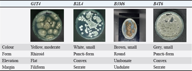 Fig. 5. Phylogenetic tree of potential isolates G1T4 and B3M6. DiscussionMacroscopic characterization and microscopic identificationSampling from Lombok Waters, West Nusa Tenggara, yielded four distinct mollusc species. One of the identified samples belonged to the gastropod class (Cypraea moneta), while the remaining samples were from the bivalvia class, including Spondylus sp., S. squamosus, and A. vexillum. Gastropod and bivalve mollusc exhibit unique morphological traits, underscoring the ecological diversity and the region’s marine habitats. Molluscs are known for their adaptability across a wide range of aquatic environments, which contributes to their ecological success. The fungal isolates (G1T4, B2L4, B3M6, and B4T6) were purified and characterized to distinguish their origin from the specific mollusc host (Table 1). The characterization revealed in colony color, edge morphology, and elevation. Fungal isolates associated with seagrass ecosystems predominantly exhibited green to greyish colony colors. The distinctive feature reflects the biodiversity of fungi associated with different marine habitats. Aligns with findings by Baron and Rigobelo (2022), who reported that fungi adapted to specific environments often display unique colony colors and morphologies, indicating habitat-driven diversity. According to Naranjo-Ortiz and Gabaldón (2019), such variations arise from physiological adaptations to environmental conditions. However, it is important to note that the colony size and colour may change over time as the fungal culture age (Sy. Pakaya et al., 2023). Microscopic identification of fungal isolates associated with molluscMicroscopic identification was conducted to examine the morphological characteristics of four potential fungal isolates using a binocular microscope at 100x magnification (Fig. 1). The objective of these observations was to assess the structure of hyphae, the presence of septa, and the shape of spores (Demeni et al., 2021). Microscopic examination of fungal cultures prepared on glass slides revealed that the following isolates G1T4 and B2L4 exhibited septate hyphae and well-defined conidiophores. Isolate B3M6 also displayed conidiophores, but its hyphae were non-septate. Isolate B4T6 showed the presence of conidiophores; however, hyphae and septa were not clearly visible under the microscope. Conidiophores, also known as conidial stalks, are specialized structures where conidia (asexual spores) are produced. Hyphae are the fundamental filamentous structures of fungi and can vary in size and appearance depending on the species and environmental conditions (Arifah et al., 2023). Phytochemical screening and TLC analysis of mollusc-associated fungal extractsMass cultures of potential mollusc-associated fungal isolates were extracted using ethyl acetate as the solvent. Ethyl acetate was selected due to because of its semi-polar nature, which enables efficient extraction of metabolites and bioactive compounds from the fungal biomass. It is a volatile, non-hygroscopic solvent with low toxicity (Minarni et al., 2017). The resulting crude extracts underwent phytochemical screening to identify the presence of secondary metabolites. The flavonoid test, conducted using 37% hydrochloric acid and magnesium powder, confirms the presence of flavonoids in G1T4 and B3M6. Alkaloid screening using Mayer’s, Wagner’s, and Dragendorff’s reagents indicated that all four fungal extracts (G1T4, B3M6, B4T6, and B2L4) tested positive for alkaloids. The saponin test revealed a result only for G1T4, while the other isolates showed no saponin content. Tests for steroids and tannins, using the Liebermann–Burchard reagent and 5% FeCl3, respectively, did not detect these compounds in any of the fungal extracts. The production of bioactive compounds by these fungi is believed to be influenced by their interaction with mollusc hosts. Studies by Photolo et al. (2020) and Singh and Kumar (2023) suggest that bioactive compounds may be transferred from the host to the associated fungi, enabling the fungi to synthesize secondary metabolites as a defence against pathogenic microbes. TLC was performed to further analyze the extracts. Each sample was applied to a silica gel plate (stationary phase), and a mixture of ethyl acetate: chloroform (7:3) served as the mobile phase (Fig. 2). Visual inspection revealed faint stains on plates, which became clearly visible under UV light at wavelengths of 366 nm and 254 nm. The UV observation showed that the stains had Rf values of 0.88 and 0.61 for the G1T4 extract, 0.96 and 0.60 for the B3M6 extract, 0.85 and 0.56 for the B4T6 extract, and 0.86 and 0.56 for the B2L4 extract (Table 2). Rf values indicate the identity of secondary metabolites present in the extracts (Khan et al., 2014). The provide insight into Rf values ranging from 0.85 to 0.96 are indicative of alkaloids (Sari et al., 2024), while values between 0.56 and 0.61 suggest the presence of flavonoids (Fathoni et al., 2021). Antibacterial and antifungal testing of fungal extractsAntibacterial and antifungal assays were performed to evaluate the bioactive of fungal extracts against selected human pathogens, including E. coli, S. aureus, C. albicans, and T. harzianum, all known to cause infections in human (Yagnik et al., 2021). Fungal derived from mollusc-associated isolated, demonstrated inhibitory extract from the fungus associated with molluks exhibited antibacterial and antifungal activity against these pathogens. A concentration of 1,000 μg per disc was used for all tests. This dosage was concentration was selected based on prior research, indicating that lower concentrations resulted in reduced antibacterial and antifungal activity (Mehta, 2020). Antibacterial and activity and molecular identification of mollusc-associated fungiThe results of antibacterial and antifungal testing demonstrated that the extract from fungal isolate G1T4 exhibited strong activity against the all four tes