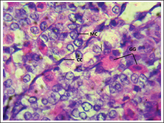 Fig. 3. Shows the cells of the cardiac zone in the neonatal dog: mucous cell (MC), Parietal cell (PC), and Chief cell (Cc). H&E stain X400. Table 1. Thickness of stomach tunics in the cardiac, fundic, and pyloric regions of neonatal dogs (µm).