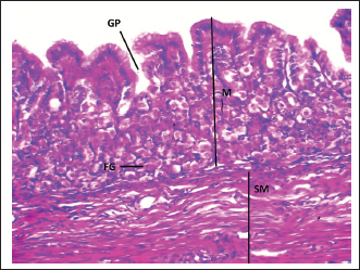 Fig. 4. Shows the fundic zone in a neonatal dog: Mucosa (M), Gastric pit (GP), Fundic Gland (FG), Submucosa (SM). H&E stain X40.