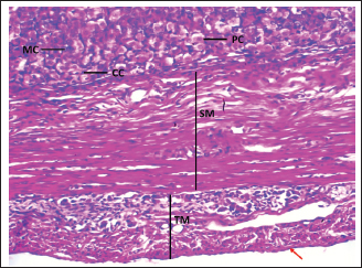 Fig. 5. Shows the fundic zone in a neonatal dog: Mucous cell (MC), parietal cell (PC), chief cell (CC), tunica submucosa (SM), tunica muscularis (TM), and serosa (red arrow). H&E stain X100. Table 2. Number of glands, parietal cells, and chief cells in the cardiac, fundic, and pyloric regions of the stomach in neonatal dogs.