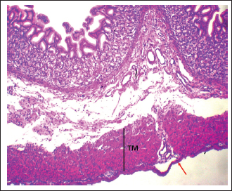 Fig. 7. Shows the pyloric zone in a neonatal dog: Tunica Muscularis (TM), and serosa (red arrow). H&E stain X40. Cardiac zoneThe cardiac glands were located exclusively near the cardiac orifice. Histologically, they were simple, branched, and tubular, forming shallow, slit-like gastric pits. The stomach wall consisted of the standard layers: a mucosa with simple columnar epithelium, a two-layered muscularis mucosa, a loose connective tissue submucosa, a two-layered muscularis with Auerbach’s plexus, and an outer serosa. In this region, the glands were composed mainly of mucous cells with low columnar shapes and basal nuclei; parietal cells were rare, and chief cells were absent (Figs. 1 and 2). The parietal cells, which had centrally placed nuclei, appeared as spherical or almost spherical bodies. The secretory units of the cardiac glands had an oval or spherical form, and their overall number was lower than that found in other stomach regions (Figs. 2 and 3). This investigation found that, in the cardiac gland area of puppies, the average measurements for epithelial height, lamina propria thickness, and the muscularis mucosa, submucosa, muscularis, and serosa layers were around (15.22 ± 1.12 µm, 125.21 ± 1.15 µm, 21.10 ± 1.44 µm, 101.63 ± 3.11 µm, 200.10 ± 10.45 µm, and 31.12 ± 2.46 µm) in that order (Table 1). For neonatal dogs, the calculated number of glands in this area reached 22.42 ± 1.22, while the mean counts for the cells of parietal and chief about (0.72 ± 0.16; 2.24 ± 0.11), respectively.