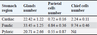 Pyloric zoneThe pyloric region was characterized by short, straight, unbifurcating folds that overlapped invaginations of the gastric crypts. Pits in this region were deeper than those in the cardiac and fundic regions. The lining was made up of simple columnar epithelium with an epithelial height of 16.46 ± 1.41 µm (Fig. 6) (Table 1). The lamina propria contained vascular connective tissue disseminated with pyloric glands (Fig. 8). The lamina propria thickness was 122.44 ± 8.55 µm, and the mean number of pyloric glands was 20.71 ± 2.66 (Tables 1 and 2). Beneath the lamina propria, the muscularis mucosa was composed of smooth muscle fibers organized into inner circular and outer longitudinal layers, with a mean thickness of 23.11 ± 1.54 µm (Fig. 7). Tunica submucosa was constituted of loose connective tissue containing blood and lymphatic vessels, collagen fibers, fibroblasts, and adipocytes. The muscularis externa contained two layers of smooth muscle fibers: an inner thick circular layer and an outer thinner longitudinal layer. The tunica submucosa and muscularis externa thicknesses were 103.74 ± 2.44 µm and 201.42 ± 14.77 µm, respectively (Table 1). The outermost layer was the serosa, which was composed of mesothelium and loose connective tissue with a mean thickness of 30.42 ± 3.56 µm (Table 1). Mucous-secreting cells formed the majority of this cell population, and there were few parietal cells, averaging 0.55 ± 0.87, and chief cells were not present (Table 2). Mucous-secreting cells were pyramidal in shape with basally placed nuclei (Fig. 8).