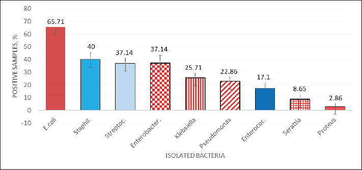 Fig. 3. Summary of the quantitative distribution of microorganisms isolated from Blatta orientalis across all pig farms. DiscussionCockroaches are recognized as sanitary and hygienic pests of high epidemiological importance, acting as vectors for numerous pathogenic agents. When inhabiting contaminated environments or consuming infected food and water, various viruses, bacteria, fungi, and protozoa may persist on their exoskeletons or within their digestive tracts for extended periods and be subsequently released into the environment (Moges et al., 2016; Liu et al., 2024; Crespo et al., 2025). Fang et al. (2013) and Chen et al. (2023) emphasize the critical need to assess microbial contamination in cockroach populations, particularly those cohabiting with humans and animals. Globally, most studies in this area have focused on German cockroaches and other synanthropic or exotic species. In Bulgaria, one of the few studies was conducted by Popova et al. (2010), also on an exotic cockroach species. However, there remains a substantial knowledge gap regarding the vectorial role of the black oriental cockroach, especially considering its frequent and severe infestations in pig farming facilities documented in our field observations. In our investigation, significant surface bacterial contamination was detected in oriental cockroaches from pig farms (Table 1). The isolates included nine microbial taxa: Escherichia coli, Staphylococcus spp., Streptococcus spp., Enterobacter spp., Klebsiella pneumoniae, Pseudomonas spp., Enterococcus spp., Serratia marcescens, and Proteus mirabilis. These microorganisms are considered conditionally pathogenic, forming part of the normal or transient flora of the skin, mucous membranes, and intestines of mammals and birds, yet capable of causing disease under specific conditions in humans and animals. Our findings are consistent with previous studies, such as those by Zarchi and Vatani (2009), who identified 19 bacterial species from cockroach surfaces and digestive tracts, including E. coli, Group D Streptococcus, Bacillus spp., Klebsiella pneumoniae, and Proteus vulgaris. Similarly, Khodabandeh et al. (2020) reported a dominant presence of Klebsiella spp., Pseudomonas spp., Proteus spp., Citrobacter spp., Enterobacter spp., and Serratia spp. in German cockroaches. A pronounced prevalence of Gram-negative bacteria, particularly from the Enterobacteriaceae family, was observed in our samples. This aligns with previous studies reporting similar bacterial profiles in German and American cockroach species and supports the potential role of cockroaches in spreading enteropathogens (Fotedar et al., 1991; Cloarec et al., 1992; Fotedar et al., 1992; Kobayashi et al., 1999; Pai et al., 2003; Magdy et al., 2023; Nirwan et al., 2024; Zainab Adesewa et al., 2024). Experimental studies by Zurek and Schal (2004) demonstrated that cockroaches shed large amounts of viable, virulent E. coli in their feces after initial exposure to contaminated material. Similarly, our study identified E. coli as the predominant contaminant on the surface of oriental cockroaches across all sampled farms. Pathogenic strains of E. coli are among the most frequently isolated pathogens in swine in veterinary practice (Fairbrother, 1999; Jacobson, 2022). Enterotoxigenic and verotoxigenic strains of E. coli are the main cause of colienteritis and colienterotoxicosis in newborn and weaned pigs, as well as edematous disease in postweaned pigs, often with high mortality (Bertschinger, 1999; Moon et al., 1999; Bassi et al., 2023). Waldvogel et al. (1999) reported the persistence of viable E. coli F18 strains in cockroach feces for up to 8 days’ post-exposure, with high bacterial loads (4.4 × 105 CFU g−1) comparable to those found in infected pigs (1.9 × 106 CFU g−1). This underscores the vector potential of cockroaches for these pathogens. Therefore, targeted cockroach density control is recommended as an integral part of disease prevention and control programs in pig farming (Waldvogel et al., 1999; Boneva et al., 2023). Staphylococcus spp. and Streptococcus spp. were the next most frequently isolated genera in our study. Numerous investigations have highlighted the potential role of cockroaches as vectors of bacterial pathogens, particularly these two genera. Their frequent isolation from cockroach populations suggests a possible route for transmission to humans and animals. Studies by Fotedar et al. (1991) in India, Salehzadeh et al. (2007) in Iran, and Vazirianzadeh et al. (2009) have reported significant associations between cockroach infestations and the presence of pathogenic bacteria. Additionally, Schauer et al. (2012, 2014), Lampert et al. (2019), and Petrovskiy et al. (2024) identified high concentrations of staphylococci in various cockroach species, especially in the hindgut of Shelfordella lateralis. Of particular concern is S. aureus, a bacterium colonizing the skin and mucosal surfaces of approximately 30% of the human population, known for its ability to cause serious infections (Gorwitz et al., 2008). The increasing detection of antibiotic-resistant S. aureus strains in cockroaches, as documented by Menasria et al. (2014); Islam et al. (2016); Abdolmaleki et al. (2019); Akter et al. (2023); Yun et al. (2024), underscores their growing importance as a public health threat. Our investigation revealed concerning levels of Klebsiella pneumoniae contamination across all surveyed pig farms. These findings are consistent with those of Cotton et al. (2000), who reported a high prevalence of Klebsiella in German cockroaches. Their work highlights the critical role of cockroaches as vectors in the transmission of nosocomial infections, emphasizing the urgent need for comprehensive pest control strategies in both agricultural and healthcare environments. In one of the studied farms, Proteus mirabilis was detected on the surfaces of examined cockroaches. This bacterium has also been identifie
