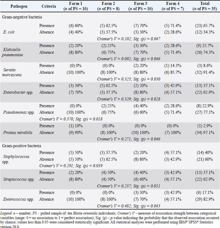The quantitative distribution of GN and GP microorganisms isolated from the surface of synanthropic cockroaches collected from the surveyed pig farms is shown in Figures 1 and 2. The Cramér's V values, ranging from 0.092 to 0.482, indicate a weak to moderate association between bacterial species variability and farm location.