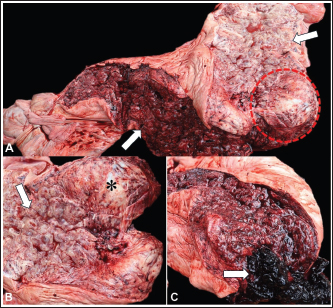 Fig. 1. Macroscopic findings of uterine leiomyoma and cystic endometrial hyperplasia in an Asian elephant (Elephas maximus). A) Uterus: markedly enlarged; projecting from the uterine wall into the lumen of the right uterine segment, white nodule measuring 10 × 10 × 8 cm (dashed); multiple cystic dilations with a thin wall, ranging from 0.5 to 4 cm (arrow), and diffusely red mucosa. B) Right uterine segment: showing the nodule (*) and cystic dilations in the mucosa (arrow). C) Left uterine segment: showing cystic dilatations and red mucosa; moderate amount of crumbly clot in the lumen. Uterine fragments were collected and fixed by immersion in 10% buffered formalin for routine histopathological processing and staining with hematoxylin and eosin (H&E). Histological sections of the uterus were subjected to Masson’s trichrome histochemical staining (Êxodo Científica, SP, Brazil). Immunohistochemistry was performed for vimentin, desmin, and smooth muscle actin. Tissue sections of 3 μm thickness were placed on charged glass slides, and endogenous peroxidase activity was blocked with Peroxidase Block (Novolink™ Kit, Cat. #RE7150-CE) for 10 minutes at room temperature (approximately 20°C). Antigen retrieval was performed in a water bath for 20 minutes at 100°C using Tris-EDTA buffer (pH 9.5) for desmin and smooth muscle actin, and in a microwave oven for 13 minutes with citrate buffer (pH 6) for vimentin. Nonspecific binding was blocked with Protein Block (Novolink™ Kit, Cat. #RE7150-CE) for 10 minutes at room temperature in a humid chamber (approximately 20°C). The following primary antibodies were used: vimentin (1:200, clone V9, Cat. #EP-12-54271, Biocare Medical, Concord, California, USA), desmin (1:200, clone D33, Cat. #EP-12-54441, Biocare Medical, Concord, California, USA), and smooth muscle actin (1:200, clone 1A4, Cat. #EP-12-52831, Biocare Medical, Concord, California, USA), all diluted in phosphate-buffered saline. Sections were incubated in a humid chamber at 4°C overnight. Subsequently, the secondary antibody (Novolink™ Post Primary) and the polymer (Novolink™ Polymer, Cat. #RE7150-CE) were applied and incubated for 30 minutes each at room temperature in a humid chamber. Visualization was achieved using 3,3’-diaminobenzidine (Novolink™ Kit, Cat. #RE7150-CE), followed by hematoxylin counterstaining. Positive controls included canine fibrosarcoma tissue (for vimentin), intestinal smooth muscle (for smooth muscle actin), and myocardium (for desmin). A universal negative control reagent (Cat. #EP-11-20567, EasyPath, São Paulo, Brazil) was simultaneously used with the tested samples. Histopathological examination revealed a poorly defined and nonencapsulated benign mesenchymal neoplastic proliferation expanding the uterine muscular layer, organized in multidirectional bundles and supported by moderate fibrovascular stroma. The cells were fusiform, with round to oval nuclei, fine chromatin, and inconspicuous nucleoli, sometimes single and prominent. The cytoplasm was moderately eosinophilic and poorly defined. Mild anisocytosis and anisokaryosis were observed, with zero mitotic figures in 2.37 mm² (Fig. 2A). In Masson’s trichrome staining, the neoplastic cells showed intense red staining, consistent with muscle tissue, whereas blue staining was restricted to the supporting fibrous connective tissue (Fig. 2B).