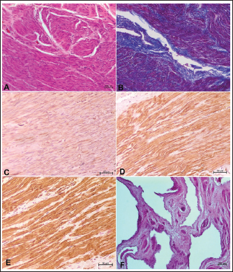 Fig. 2. Histopathological, histochemical, and immunohistochemical findings of uterine leiomyoma and cystic endometrial hyperplasia in an Asian elephant (Elephas maximus). A) Uterus: benign mesenchymal neoplastic proliferation, organized in multidirectional bundles and supported by moderate fibrovascular stroma (hematoxylin and eosin [HE], 10). B) Intense red staining, consistent with muscle tissue, while blue staining was restricted to the supporting fibrous connective tissue (Masson’s trichrome, 10x). C) Mild cytoplasmic staining of the neoplastic mesenchymal cells for vimentin (IHC, 20x). D) Moderate cytoplasmic immunolabeling of the neoplastic cells for desmin (IHC, 20x). E) Strong cytoplasmic immunolabeling of the neoplastic cells for smooth muscle actin (IHQ, 20x). F) Uterus: cystic dilatations lined by simple squamous epithelium (HE, 5x). Immunohistochemical evaluation revealed mild vimentin staining in the cytoplasm of the neoplastic cells, moderate desmin immunoreactivity, and strong smooth muscle actin expression in the neoplastic cells (Fig. 2C–E). Additionally, cystic dilations lined by simple squamous epithelium were observed in the mucosa (Fig. 2F), sometimes containing eosinophilic amorphous material, as well as moderate multifocal hemorrhage and congestion. Based on the anatomopathological, histochemical, and immunohistochemical findings, uterine leiomyoma and cystic endometrial hyperplasia were diagnosed. DiscussionElephants affected by uterine neoplasms or cystic endometrial hyperplasia range in age from 12 to 65 years (Agnew et al., 2004; Sapundzhiev et al., 2007; Pringproa et al., 2015; Landolfi et al., 2021). In our case, the 74-year-old elephant was the oldest elephant to have a neoplasm and the second oldest elephant ever reported in Brazil. Clinical signs are often absent or unreported, with cases in previous studies being diagnosed at necropsy, found incidentally, and not directly related to the cause of death (Agnew et al., 2004; Sapundzhiev et al., 2007; Pringproa et al., 2015). Although the leiomyoma and cystic endometrial hyperplasia were not the cause of death in the present case, they likely contributed to the clinical debilitation, particularly due to the animal’s advanced age and moderate intrauterine hemorrhage, which probably resulted in anemia, as evidenced by the pale mucous membranes. The cause of death was determined to be chronic renal disease and congestive heart failure. In a recent study of 57 cases of myometrial leiomyoma, 51 had multiple masses, and six had solitary masses. In more severe cases, the nodules may coalesce, distorting the uterine architecture and invading the uterine lumen (Landolfi et al., 2021). In the reported case, the neoplasm was solitary and extensive and invaded the lumen. The high involvement of endometrial hyperplasia associated with leiomyomas (24/28; 86%) is also significant, with no cases of metrorrhagia recorded (Landolfi et al., 2021). Cystic endometrial hyperplasia and intrauterine hemorrhage were observed in this case. Leiomyomas exhibit morphological characteristics that can resemble those of other smooth muscle tumors, making differentiation challenging when based solely on macroscopic and histological evaluation. In elephants, these neoplasms may present as single or multiple, white, firm nodules of varying sizes that expand from the myometrium (Agnew et al., 2004; Sapundzhiev et al., 2007; Pringproa et al., 2015; Landolfi et al., 2021). In contrast, the nodule in our case was solitary. Furthermore, microscopically, the cellular morphology of leiomyoma is characteristic of mesenchymal cells, and our findings are similar to those described. The number of mitoses is generally low, ranging from 0 to 4, and metastasis development is not observed (Mikaelian et al., 2000; Agnew et al., 2004; Souza et al., 2012). No mitoses were observed in the present case. Possible differential diagnoses were considered based on the anatomopathological findings, with the main being, fibroleiomyoma and fibrosarcoma. Masson’s trichrome histochemical technique was used to differentiate them, as it is difficult to distinguish collagen and smooth muscle in H&E staining. In a study on genital mesenchymal neoplasms in female dogs, fibroleiomyomas accounted for 41.9% (18/43) of the cases, being differentiated from other neoplasms by Masson’s trichrome staining, where leiomyomas and leiomyosarcomas have less than 50% collagen (connective tissue) among the neoplastic smooth muscle cells, and fibroleiomyomas have more than 50% (Souza et al., 2012). In this case, Masson’s trichrome staining confirmed a leiomyoma, with a predominance of smooth muscle cells and restricted to the supporting connective tissue. Uterine neoplasms can affect fecundity and pose challenges for managed elephant conservation. Age and nulliparity are key risk factors likely due to prolonged exposure to endogenous estrogens (Agnew et al., 2004; Landolfi et al., 2021). Elevated glucocorticoid levels, disrupted estrous cycles, and extended non-reproductive periods may dysregulate hormone receptors or local tissue responses in captivity, promoting proliferative uterine lesions (Hermes et al., 2004; Kumar et al., 2014). Immunohistochemistry is another frequently used method for diagnostic confirmation. The most commonly used markers for muscular tumors are vimentin, desmin, and smooth muscle actin (Pringproa et al., 2015; Veiga-Parga et al., 2016). Immunohistochemistry was performed for all three markers in the present case. Regarding vimentin immunostaining, a study on uterine tumors in dogs reported staining in >50% of neoplastic cells (Souza et al., 2012). Similar findings were also described in two Asian elephants with uterine leiomyoma, showing diffuse vimentin staining; however, the staining intensity was not specified (Pringproa et al., 2015). The mild immunostaining observed in our case may be associated with the low affinity of the primary antibody for the 