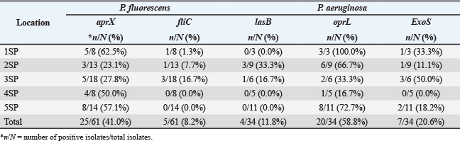 Table 3 shows distinct patterns in the presence of P. fluorescens and related genes. At 1SP, 5 isolates (62.5%) were positive for the aprX gene, (Fig. 2) the highest among all sampling locations, while only 1 isolate (1.3%) was positive for fliC (Fig. 2). At 2SP, 3 isolates (23.1%) carried aprX, and 1 isolate (7.7%) carried the fliC gene. At 3SP, 5 isolates (27.8%) were positive for aprX, while 3 isolates (16.7%) were positive for fliC. However, in both 4SP and 5SP no presence of fliC gene was detected in P. fluorescens isolates at 4SP and 5SP.