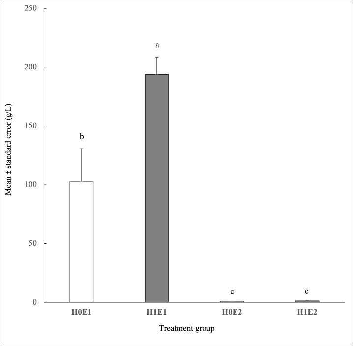 The interaction treatments impacted (p < 0.01) the glucose production (Fig. 3). H1E1 treatment had the highest glucose content (193.94 ± 14.51 g/L) among all treatments. Moreover, the glucose level in the H0E1 group was higher than that in the H0E2 and H1E2 groups (102.96 ± 27.59 vs. 0.91 ± 0.15 and 1.32 ± 0.37 g/L, respectively). The combination treatments had no effect (p > 0.05) on ethanol production (Fig. 4).. Heat treatment did not (p > 0.05) influence the ethanol content. However, enzyme treatment affected (p < 0.01) the ethanol level. The ethanol production in the H0E1 and H1E1 groups (0.55% ± 0.13% and 0.99% ± 0.02% v/v) was higher than the ethanol content in the H0E2 and H1E2 treatments (0.19% ± 0.11% and 0.28% ± 0.10% v/v).