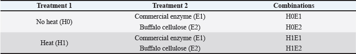 Methods: A factorial experiment was performed with heat (H) and enzyme (E) combinations. The treatment was as follows: (1) no heat and commercial enzyme (H0E1), (2) heat and commercial enzyme (H1E1), (3) no heat and buffalo rumen enzyme (H0E2), and (4) heat and buffalo rumen enzyme (H1E2) with three replications. The enzyme activity, glucose, and ethanol levels were measured.