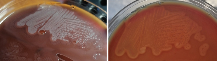Fig. 3. Mixed cultures of the tested pathogens. Proteus exhibited swarming growth on solid nutrient media, whereas the second isolate exhibited beta-hemolysis.