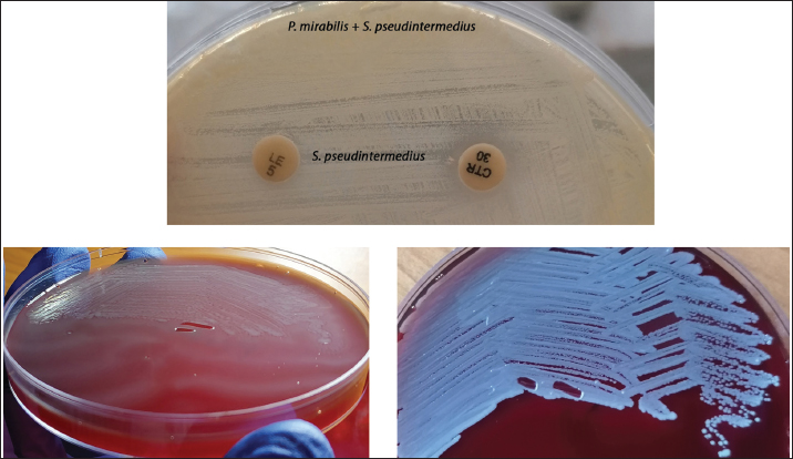 Blood agar, MacConkey agar, Sabouraud medium, and thioglycolate broth were inoculated. We made a glass slide on which we observed gram-negative rods and gram-positive cocci. The nutrient media results were as follows: massive growth of a gram-positive beta-hemolytic bacterium on blood agar in the presence of Proteus sp., massive growth of lactose-negative colonies on McConkey agar, and no growth on Sabouraud. The swarming growth of Proteus sp. made it difficult to isolate pure cultures of the other species (Fig. 3). We unsuccessfully tried to inhibit the motility of Proteus sp. by a method described by French authors, dropping 90% ethanol on the lid of the petri dish (Hernandez et al., 1999). Thereafter, we made a mixed antibiogram on Muller-Hinton agar using a suspension containing both agents. Subsequently, we could isolate the gram-positive species because only it provided growth next to the levofloxacin and ceftriaxone discs (Fig. 4). Further tests were performed. Some conventional methods used in the diagnostics of gram-positive and gram-negative bacteria, such as the catalase test, clumping factor test, and tube coagulase test, as well as Kligler’s iron agar, indole test, and urease tests, were applied. The gram-positive specimen was misdiagnosed as S. epidermidis with a probability of 92% by BD Phoenix™ M50 (Becton Dickinson, New Jersey, USA). The final identification of both species was performed using MALDI-TOF MS (VITEK MS system, bioMerieux, Craponne, France). Proteus mirabilis and S. pseudintermedius. Bauer-Kirby disc diffusion method was used to determine antimicrobial susceptibility. The interpretation was done according to the European Union for the Conservation of Species and Antibiotics (EUCAST) guidelines (2024) (EUCAST, 2024). S. pseudintermedius was multidrug-resistant (MDR), including methicillin resistant. The results are presented in Table 1.