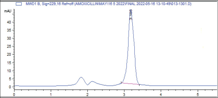 Fig. 4. The results of the quantification of different concentrations of amoxicillin spikes, HPLC system. DiscussionThe use of antibiotics is relevant in the poultry industry owing to the need to enhance the production of meat through disease prevention, feed conversion, and growth rate. In poultry production, antibiotics are generally used at sub-therapeutic doses for the promotion of growth and birds' health protection (Mehdi et al., 2018) because they also follow hermetic responses (Ahmed et al., 2020; Ahmed et al., 2022). The quality of drinking water generally affects both the absorption and antibiotics bioavailability. (Kotb et al., 2019). Different concentrations of the metals cause different responses to the bioavailability of the antibiotics at different times. For instance, low levels of Zn, Pb, Mn, and Cu, and high levels of Zn and Pb resulted in a significant (p < 0.001) increase in the Cmax of oxytetracycline after 2 hours of treatment while a low level of the mixture and high level of Fe, Cu and mixture resulted in a significant (p < 0.001) decrease in the Cmax of after 2 hours of treatment in comparison with the control group while low levels of Fe and Cu, and high levels of Zn and Fe resulted in a significant (p < 0.001) increase in the Cmax of amoxicillin after 2 hours of treatment. The obtained results indicated that the metals affected the bioavailability of antibiotics for broiler chicken to oxytetracycline and amoxicillin. These results agree with the results recorded by other studies (Wang et al., 2008; Zhao et al., 2013; Yao et al., 2020). According to the literature, when the ratio of concentration between Cu and oxytetracycline was 1:1, the adsorption of oxytetracycline was enhanced significantly, while oxytetracycline had a weak effect on the adsorption of Cu (Xue et al., 2021). Similarly, certain metals enhanced antibiotics' adsorption capacities, while antibiotics had only a slight enhancement in some metal's adsorption capacities (Yao et al., 2020) The quality of drinking water affects both antibiotic absorption and bioavailability in the bodies of animals. Thus, poor quality of water influences the bioavailability and stability of tetracycline. However, there is a non-significant statistical correlation between HMs correlation in water and the decrease of doxycycline therapeutic concentration in vitro (Kotb et al., 2019). However, the poor quality of water in developing countries is responsible for the use of higher doses of antibiotics to attain the required optimum concentration in treated animals (Dosoky et al., 2015; Okocha et al., 2018). ConclusionThe quality of drinking water affects both antibiotic absorption and bioavailability in the bodies of broiler chickens. Thus, poor quality of water negatively affects the bioavailability and stability of antibiotics. Different concentrations of the metals cause different responses to the bioavailability of the antibiotics at different times in the experimental broiler chickens. AcknowledgmentsThe Researcher would like to thank the Deanship of Graduate Studies and Scientific Research at Qassim University for financial support (QU-APC-2025) Conflict of interestThe author declares that he has no conflict of interest. FundingNone. Authors' contributionA.I.A. Study design, Sample and data collection, Methodology, result analysis and interpretation, Writing—original draft, and Writing–review & editing. A.I.A. has read and agreed to the published version of the manuscript. Data availabilityAll data were provided in the manuscript. ReferencesAhmed, I.A. and Mikail, M.A. 2024. Diet and skin health: the good and the bad. Nutrition 119, 112350. Ahmed, I.A., Mikail, M.A., Zamakshshari, N. and Abdullah, A.S.H. 2020. Natural anti-aging skincare: role and potential. Biogerontology 21(3), 293–310. Ahmed, I.A., Mikail, M.A., Zamakshshari, N.H., Mustafa, M.R., Hashim, N.M. and Othman, R. 2022. Trends and challenges in phytotherapy and phytocosmetics for skin aging. Saudi J. Biol. Sci. 29(8), 103363. Aldaddou, W.A., Aljohani, A.S.M., Ahmed, I.A., Al-Wabel, N.A. and El- Ashmawy, I.M. 2022. Ameliorative effect of methanolic extract of Tribulus terrestris L. on nicotine and lead-induced degeneration of sperm quality in male rats. J. Ethnopharmacology 295, 115337. Aljassim, M.T., Almulla, A.A., Berekaa, M.M. and Alsaif, A.S. 2024. Evaluating the influence of reverse osmosis on lakes using water quality indices: a case study in Saudi Arabia. Water 16(10), 1351. Alshehri, F., El-Sorogy, A.S., Almadani, S. and Aldossari, M. 2023. Groundwater quality assessment in western Saudi Arabia using GIS and multivariate analysis. J. King Saud Univ. - Sci. 35(4), 102586. Ammar Aldaddou, W., Aljohani, A.S.M., Adewale Ahmed, I., Al-Wabel, N.A. and El-Ashmawy, I.M. 2023. Salvia officinalis L. methanolic extract reduces lead and nicotine-induced sperm quality degeneration in male rats. Chem. &. Biodivers. 20(7), e202300115. APHA. 2005. Standard Methods for the Examination of Water and Wastewater. 21st Edition, American Public Health Association/American Water Works Association/Water Environment Federation, Washington DC. Briffa, J., Sinagra, E. and Blundell, R. 2020. Heavy metal pollution in the environment and their toxicological effects on humans. Heliyon 6(9), 4691. Dosoky, R., Kotb, S. and Farghali, M. 2015. Efficiency of silver nanoparticles against bacterial contaminants isolated from surface and ground water in Egypt. J. Adv. Vet. Anim. Res. 2(2), 175–184. El Osta, M., Masoud, M., Alqarawy, A., Elsayed, S. and Gad, M. 2022. Groundwater suitability for drinking and irrigation using water quality indices and multivariate modeling in Makkah Al-Mukarramah Province, Saudi Arabia. Water 14(3), 483. El-Rawy, M. and Fathi, H. 2023. Groundwater pollution sources and its quality in the kingdom of Saudi Arabia: State of the Art. Femke, V., de Carvalho Ferreira, H.C., Devreese, M., Dewulf, J., Daeseleire, E., Eeckhout, M. and Croubels, S. 2020. St