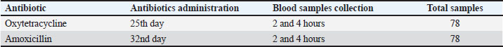 Collection of blood samplesOxytetracycline hydrochloride soluble powder was administered in the drinking water of chickens at a level of 1g/l of drinking water, while amoxicillin trihydrate was administered at 1g /10 kg of BW. Clock-watch timing was used to achieve a near timing interval between drug administration and sampling of the blood from the wing vein, thus, time differences between targeted and actual blood sampling times were at most 2 minutes (Sumano et al., 2004). On the 25th and 32nd days of the examined broiler's age, approximately 2–3 ml blood samples from three randomly selected chickens per group were drawn from the wing vein in a clean plastic centrifuge tube. Blood samples for oxytetracycline analysis were collected on the 25th day of age at 2 hours and 4 hours intervals after drug administration while amoxicillin sample analysis was collected on day 32nd of age at 2 hours and 4 hours intervals after drug administration (Table 3) where, these interval times at which the antibiotics could reach their maximum serum concentration Cmax in the blood according to (Vancutsem et al., 1990). Blood samples were left at room temperature for 2 hours to clot. The samples were centrifuged at 3,000 rpm for 10 minutes (Centrifuge – CL008, CYAN), serum was collected in clean Eppendorf tubes, then 200 μl will be pooled from each serum sample/ the same group and placed together in one Eppendorf tube to represent one serum sample of 600 μl volume/each group. Finally, a total of 156 serum samples were obtained, labeled, and stored at −20°C for subsequent evaluation of the efficiency of the antibiotics (oxytetracycline and amoxicillin) in the laboratory using (HPLC). Table 3. Time of antibiotics administration and collection of samples.