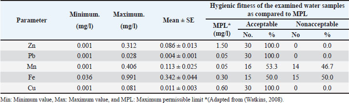 AbstractBackground: The quality of drinking water affects antibiotic bioavailability in the broiler chickens. Aim: The current study highlights on the influence of water quality on the bioavailability of antibiotics in broilers. The water quality was determined based on the Zn, Cu, Fe, Mn, and Pb levels. Methods: The animal study involved 234 chickens divided into 6 broad groups. Chickens in subgroup A received water containing the maximum level of metals (low dose) while chickens in subgroup B received water containing 5 × of the A subgroup (high dose). The control group was given a bottled. The effects of metals in drinking water on the bioavailability of oxytetracycline and amoxicillin were evaluated for the various groups. Different concentrations of the metals cause different responses to the bioavailability of the antibiotics at different times. Results: Low levels of Zn, Pb, Mn, and Cu, and high levels of Zn and Pb resulted in a significant (p < 0.001) increase in the Cmax of oxytetracycline after 2 hours of treatment as compared with the control group. Low levels of Zn, Pb, Mn, Fe, and Cu, and high levels of Zn, Pb, and Mn also resulted in a significant (p < 0.001) increase in the Cmax of oxytetracycline after 4 hours of treatment as compared with the control group. Similarly, the water treated with low levels of Fe and Cu, and high levels of Zn and Fe resulted in a significant (p < 0.001) increase in the Cmax of amoxicillin after 2 hours of treatment as compared with the control group. Conclusion: The concentrations of the studied heavy metals significantly affect the bioavailability of the antibiotics and alter their effectiveness. Keywords: Antibiotics, Bioavailability, Broilers, Poultry, Saudi Arabia. IntroductionGroundwater resources remain the most important freshwater supply for various human activities. For the past 50 years, however, the susceptibility of aquifers to chemical pollution from different human activities has been unprecedented (Mallick et al., 2021; El-Rawy and Fathi, 2023). Other critical issues, like water resource scarcity and extensive groundwater exploitation, are also experienced by arid and semi-arid regions that suffer from multiple problems with water sources (El Osta et al., 2022; Aljassim et al., 2024). Saudi Arabia is an arid country, and the most essential natural resource for agriculture, domestic, and industrial uses is groundwater (Alshehri et al., 2023; Odnoletkova and Patzek, 2023). Water quality has become a major concern in most countries, especially in arid and semi-arid regions where water shortage is a common phenomenon (Morante-Carballo et al., 2022; Ingrao et al., 2023). However, the assessment of water quality has been given little attention. The wide use of groundwater for various agricultural, domestic, and industrial purposes makes it a valuable resource. On the other hand, Saudi Arabia has a scarce water resource, one of the driest world regions. Pollution from domestic sewerage, discharge of industrial effluent, and agricultural fertilizers is also affecting most shallow groundwater around Saudi Arabia's major cities (Mallick et al., 2021). Therefore, water quality and shortage are major issues in most places, especially in arid and semi-arid world regions, including Saudi Arabia (El Osta et al., 2022). Medication delivery through waterlines for poultry is a well-established procedure that can provide a more effective therapeutic dose. Medicine solubility in stock buckets and water lines may vary based on water quality and medicine makeup (Femke et al., 2020). Most drugs have electron-donor characteristic groups with affinity to bind with metallic ions. Furthermore, certain metals such as copper, iron, zinc, chromium, cobalt manganese, selenium, and molybdenum are nutrients and essential metal ions, thus playing an important role in maintaining normal healthy living in animals and humans. As a result, their excesses or deficiencies and abnormalities in their metabolism may cause serious diseases and mortality (Ahmed et al., 2020; Kontoghiorghes and Kontoghiorghe, 2020; Ahmed and Mikail, 2024). The important role of these essential metal ions is an integral part of enzymes and proteins, as well as that of transcription factors and other co-factors that secure the normal growth and development of the body. These metal ions, and especially iron, play a central role in important physiological processes such as oxygen transport and utilization, as well as respiration, and also other processes involving the metabolism of proteins, lipids, carbohydrates, and nucleic acids (Saleh et al., 2023). Heavy metals (HMs) in groundwater occur in particulate, colloidal, and dissolved phases (Aldaddou et al., 2022; Ammar Aldaddou et al., 2023; Zhu et al., 2023). Their natural sources are possibly volcanism-extruded products leaching and weathering rocks, while their anthropogenic sources are mostly from domestic and industrial effluents and the disposal of solid wastes (Briffa et al., 2020; Mitra et al., 2022). The water used with antibiotics should be of good quality to get the most effect for most antibacterial drugs (Hanna et al., 2020). For instance, quinolones are common agents of complexation for various metallic ions, as well as transition and alkaline earth metallic ions. Quinolones’ coordination with metallic ions, including Mg2+, Cu2+, and Ca2+, is very important for quinolone antibiotic activity (Uivarosi, 2013). Increasing concentrations of HMs are also responsible for antibiotic resistance decline (Zhu et al., 2023). There have been several reports about how the interactions between HMs and tetracycline modify the desorption and sorption behaviors (Wang et al., 2008). Therefore, the current study was aimed at investigating the influence of pollution and water quality used in some poultry farms located in the Qassim region on the bioavailability of antibiotics in broiler chickens. Materials and MethodsWater sample collectionsThirty