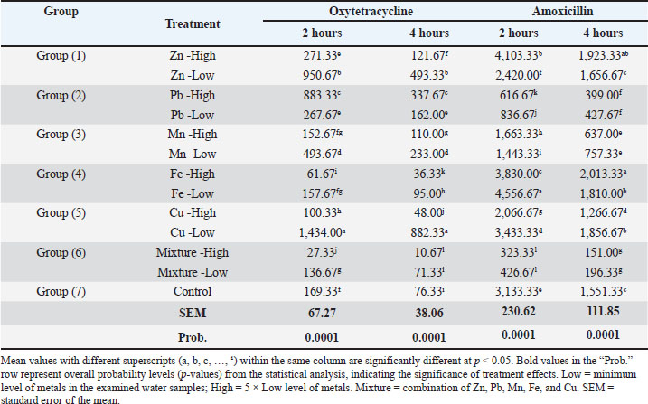 Effect of metals in drinking water on the bioavailability of oxytetracycline and amoxicillinThe results (Table 5 and Fig. 1) showed that the water treated with low levels of Zn, Pb, Mn, and Cu, and high levels of Zn and Pb resulted in a significant (p < 0.001) increase in the Cmax of oxytetracycline after 2 hours of treatment as compared with the control group. In addition, a low level of the mixture and high levels of Fe, Cu, and mixture resulted in a significant (p < 0.001) decrease in the Cmax of oxytetracycline after 2 hours of treatment in comparison with the control group. On the other hand, no significant differences were found among the control and low level of Fe and high level of Mn. Table 5. Effect of metals on the bioavailability of oxytetracycline and amoxicillin.