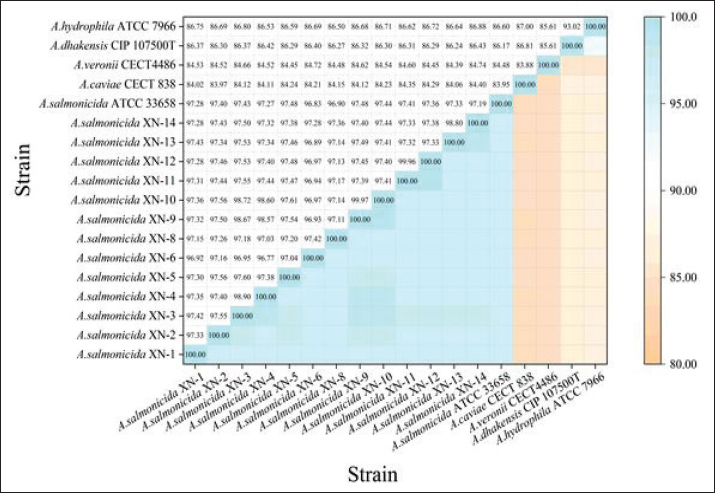 Fig. 3. ANI heatmap of the Aeromonas strains. This matrix illustrates the pairwise OrthoANI values among 13 experimental A. salmonicida strains, the A. salmonicida QC strain ATCC 33568, and four closely related QC strains. The color intensity in the lower-right heatmap corresponds to the ANI value, which is also numerically displayed in the upper-left quadrant. The genomic data used for this analysis were sourced from the NCBI database (for accession numbers, Table 1). The OrthoANI algorithm was used for the analysis, and the visualization was generated with Origin 2024 software.