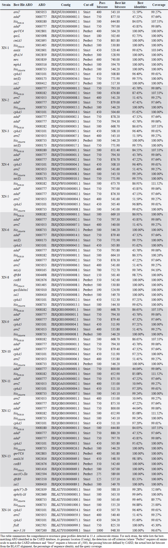 Fig. 4. Resistance rates of A. salmonicida to 20 antibiotics This graph presents the resistance profile of 13 strains of A. salmonicida, isolated from pig farms in Jilin Province, China, to 20 antibiotics. Before performing the MIC test, each isolate was subcultured in fresh BHI broth and incubated at 37°C for 12 hours. Antimicrobial susceptibility testing was performed using the agar dilution method on MHA. The QC strain was E. coli ATCC 25922. Red, resistance; yellow, intermediary; and blue, sensitive. The numerical value within the brackets represents the specific region identifier. The following corner markers illustrate the methodology for identifying the MIC inflection point: 1: M45 (CLSI, 2016, Aeromonas spp.); 2: M100 (CLSI, 2023, Enterobacterales); 3: M42 (CLSI, 2011, Aeromonas salmonicida); 4: (Esteve et al., 2012). To further screen for carbapenemase production phenotypically, the modified Carbapenem Inactivation Method (mCIM) was performed on all 13 experimental A. salmonicida isolates, following the guidelines outlined in CLSI M100 (33th ed., 2023). Briefly, a 1 μl loopful of bacteria from an overnight culture on sheep blood agar was emulsified in 2 ml of tryptic soy broth for each isolate. A 10 μg meropenem disk was then immersed in the bacterial suspension. After incubation at 37°C for 4 hours, the disk was retrieved and placed onto an MHA plate seeded with the meropenem-susceptible E. coli ATCC 25922 indicator strain. The inhibition zone around the disk was measured after an additional 18 hours of incubation at 37°C. All tests were performed in triplicate to ensure reproducibility. Second-generation sequencing analysisBacterial cultures were maintained under controlled incubation conditions until the logarithmic growth phase was achieved. We subjected the cell culture media to centrifugation at 7,000 rpm for 15 minutes to prepare them. The quality of the extracted DNA was verified using a NanoDrop spectrophotometer (A260/A280 ratios between 1.8 and 2.0) and 1% agarose gel electrophoresis. Qualified DNA samples were subjected to library preparation using the TrueLib DNA Library Rapid Prep Kit for Illumina (Yitaike Biotech Co., Ltd.) and subsequently submitted to Bemac Biotechnology Co. (Qingdao, China) for Illumina sequencing, which generated an average sequencing depth of 100× per genome. Raw sequencing reads were processed using fastp (version 0.23.2) to remove adapters and low-quality bases with the following parameters: -Q -y -g -Y 10 -l 100 -b 150 -B 150 (Haibin et al., 2012). Subsequently, reads were further filtered using fastq_filter_by_Qxx to retain only high-quality sequences with a minimum Q30 score threshold of 85% over a 30-bp sliding window (-q 0.85 -w 30). For genome assembly, the filtered reads were assembled using the Spades v3.6.2 software (Prjibelski et al., 2020). The assembly quality was assessed based on the contig N50 values. Furthermore, antibiotic resistance genes were identified using the Resistance Gene Identifier tool (Web portal version 6.0.5) against the Comprehensive Antibiotic Resistance Database (CARD, version 4.0.1). The analysis involved the following steps and criteria: Open Reading Frames were first predicted from the input DNA sequences using Prodigal; homolog detection was then conducted using DIAMOND. The results were filtered to include only "Perfect" and "Strict" ('Perfect' requires all amino acids to match the CARD reference and “Strict” requires a bitscore of ≥500) hits. The presence/absence of Antibiotic Resistance Genes was summarized into a binary matrix and used to construct a dendrogram illustrating strain clustering based on ARG profile similarity. Clustering analysis and visualization were performed in Origin 2024 using the UPGMA and Euclidean distance, with both circular and radial dendrogram layouts applied to visualize natural grouping patterns. Ethical approvalVerbal consent was obtained from the farm manager prior to sample collection, nasal swab samples were collected from pigs exhibiting mild respiratory symptoms by veterinarians. The sampling method was non-invasive and strictly adhered to animal welfare guidelines, ensuring that any potential distress to the animals was minimized. The study was approved by the Institutional Animal Ethics Committee of Jilin Agricultural Science and Technology College (Reference number: LLSC202301055), with an approved project period from January 2023 to December 2024. All procedures performed on the animals followed the ethical standards of the institution. ResultsIdentification and phylogenetic analysis of isolates of A. salmonicidaSequencing data were analyzed using the Basic Local Alignment Search Tool (BLAST) on the NCBI platform. The initial taxonomic identification of all 13 strains was confirmed by 16S rRNA gene sequencing, which revealed >99.00% sequence identity with A. salmonicida reference sequences. To further validate this identification, we performed multilocus sequence typing (MLST) based on the second-generation sequencing data of the 13 experimental strains using the PubMLST database. All strains were unequivocally assigned as A. salmonicida using the MLST scheme, thereby consolidating the initial BLAST-based identification. Phylogenetic analysis based on 16S rRNA gene sequences was conducted using a dataset of 66 strains, including 13 porcine-derived A. salmonicida experimental isolates, the standard strain A. salmonicida ATCC 33568, 46 A. salmonicida isolates from diverse geographical and host origins, and 6 standard strains of closely related species. The phylogenetic tree revealed distinct intraspecific clustering of the experimental strains into three major groups and one independent branch (Fig. 1; experimental isolates highlighted in red). Cluster I, comprising XN-6, XN-8, XN-9, XN-10, XN-11, XN-12, and XN-13 isolates, was strongly supported with a bootstrap value of 0.99. Cluster II, which consists of XN-4 and XN-5, received a moderate bootstrap