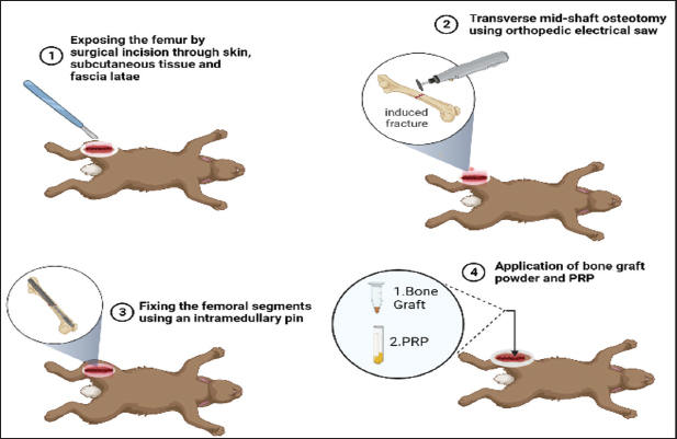 Fig. 1. The surgical steps of inducing experimental mid-shaft femoral fracture, fixing the bone fragments with an intramedullary pin, and applying PRP alone or in combination with bone graft into the fractured site (BioRender online tools). Radiographic imagingRadiographs of osteotomies were taken using a digital X-ray machine on the 10th, 20th, and 30th post-operation days. This imaging was performed to evaluate the healing process in the three groups and to compare the size of callus formation in each group. The thickness of the callus on radiographic images at 10th, 20th, and 30th days in each group. For further evaluation of the healing process, a CT scan was taken for three rabbits in each group at 30th post operation days. Three rabbits in each group were sacrificed at 30th days post-operation, and the entire femur bone of the rabbits was detached from the skin and soft tissue, such as muscle, tendons, and ligaments, and fixed in 10% Phosphate Buffered Saline-buffered formalin. These samples were transferred to Shar Hospital for CT imaging using an electron beam-type CT scan device, which assists in the complete detection of callus formation in fractured bones. ImageJ software (Version 1.49) was used to measure the degree of postoperative callus formation. Initially, the image was opened or dragged into the ImageJ software. Then, the straight-line selection tool was selected to drag a line across the calibrated ruler on the image to specify a distance (e.g., 1,000 µm). Then, the scale was set by clicking the Analyze tool, and the set scale window was opened to show the length of the dragged line in pixels (e.g., 20,000 pixels). The specified distance in pixels (20,000 pixels) determined by the freehand tool on the calibrated ruler was converted into a meter distance on the image (e.g. 1,000 µm). The callus size was measured using the straight-line tool, dragging a line over the transverse axis of the callus and the bone separately, and then calculating the callus thickness by subtracting the callus length beyond the cortex from the bone diameter at the fracture site (Fig. 2).