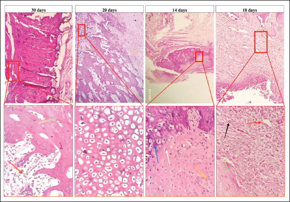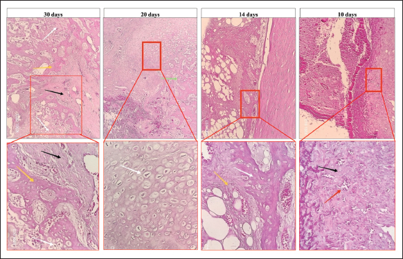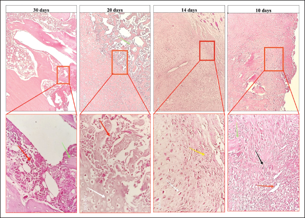 Fig. 6. Micrograph of the healing site in group A, stained with H&E, at (×10) and (× 400) magnifications: at 10 days, the bone defect was filled with mature granulation tissue, including blood vessels (red arrow), fibroblasts (black arrow), and green arrow (lamellar bone). At 14 days, fibrocartilaginous tissues that formed a soft callus containing fibrous tissue (yellow arrow) and chondrocytes (white arrow) were observed. At 20 days, the fractured area was filled with hypertrophic cartilage without calcification (white arrow) and woven bone formation with bone marrow (red arrow). Finally, at 30 days, remodeling of the woven bone to the lamellar bone associated with the bone marrow (red arrow) and development of the lamellar bone (green arrow) were observed.