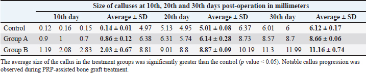 Table 2. Sizes of the calluses (mm) in the control, PRP group, and bone graft and PRP group) at 30th days post-operation on computed tomographic (CT) images.