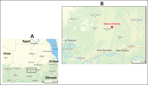 Fig. 1. Locator Map (A) illustrating the national context of Sudan, accompanied by a detailed inset (B) that provides an enlarged view of the North Kordofan region, highlighting the village of Kerwo Al Umda where the case was reported. Map created using Mapcreator (https://mapcreator.io/). Upon examination, the camel calf exhibited complete cardiac displacement outside the thoracic cavity caused by a cleft. On the left side of the animal, the heart was visible and protruded at the most ventral aspect of the cervical region, covered with pericardium and without skin (Fig. 2). Physical examination of the external appearance revealed that the protruding heart appeared normal, and the calf maintained a regular heartbeat, as confirmed by visual observation and video documentation (Video 1-Supplementary Material). The calf was alert, active, and interacted with its mother, but was unable to stand for long and suckle. No other congenital abnormalities or malformations were observed during the physical examination. Supportive care was provided by milking the mother and bottle-feeding the colostrum; however, the calf passed away approximately 2 days after birth. A necropsy was not conducted due to the unavailability of trained personnel, the long distance to the nearest veterinary hospital, and security issues arising from the ongoing civil war.