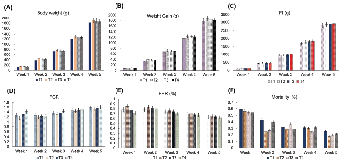Fig. 1. Growth performance of experimental broiler diets on graded levels of CRLM. The data represent the mean value of 100 samples per treatment; T1=Control, T2=10% of CRLM, T3=20% of CRLM, T4=30% of CRLM; g=Gram; FI=Feed intake; FCR=Feed Conversion Ratio FI/WG; FER=Feed Efficiency Ratio, WG/FI. (A) Weekly body weight of chicken, (B). Weight Gain, (C). Feed intake, (D). Feed Conversion Ratio, (E). Feed Efficiency Ratio, (F). Mortality. Weekly weight gain was consistently higher in T2. In week 2, weight gain in T2 reached 396.08 g, compared to 330.46 g (T1), 383.64 g (T3), and 379.42 g (T4). By week 5, cumulative gain in T2 was 1864.54 g, followed by T3 (1843.98 g), T4 (1812.06 g), and T1 (1776.88 g). FI also increased with cassava levels. In week 1, T3 and T4 had the highest FI (131.80 g and 130.96 g), while T1 had the lowest (106.54 g). By week 5, FI was highest in T4 (2908.24 g), then T3 (2896.52 g), T2 (2848.18 g), and T1 (2801.50 g). Despite higher intake in T3 and T4, T2 showed better feed efficiency. FCR in week 1 was lowest in T2 (1.16), compared to 1.28 (T1), 1.31 (T3), and 1.42 (T4). By week 5, T2 had the most efficient FCR (1.53), followed by T1 (1.58), T3 (1.57), and T4 (1.60). FER was also highest in T2 (0.65%) in week 5, while T1, T3, and T4 showed 0.63%, 0.64%, and 0.62%, respectively. Mortality was minimal across groups. In week 5, the lowest mortality was recorded in T2 (0.18%), followed by T3 (0.20%), T4 (0.22%), and T1 (0.26%) (Supplementary Table 1). Carcass yield characteristicsCarcass traits were significantly influenced by dietary treatments. The T4 group (15% root + 15% leaf) exhibited the highest dressing percentage (74.70%), followed by T3, T2, and T1, reflecting a dose-responsive trend. Notably, breast weight peaked in T4 (25.22%), though T3 (22.33%) and T2 (18.50%) also recorded substantial improvements over control. Enhanced values for thigh, drumstick, and wing weights were observed across the test diets groups, with T2 and T3 demonstrating statistically higher organ weights without negatively affecting internal organs. These findings indicate improved carcass partitioning and muscularity in broilers with increasing cassava meal inclusion (Table 2). Table 2. Carcass yield characteristics of experimental broiler diets on graded levels of cassava root and leaf meal at the age of 35 days.