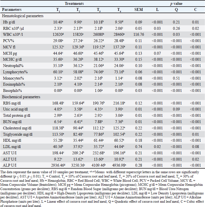Hematological and biochemical parametersCassava inclusion had a mixed effect on hematological indices. Hemoglobin, RBC, PCV, and MCHC levels were highest in the control but slightly declined in cassava-fed groups, though all remained within physiological ranges. Conversely, WBC counts and lymphocyte percentages increased significantly in T3 and T4, potentially indicating enhanced immune function. For biochemical parameters, glucose, BUN, uric acid, cholesterol, and liver enzymes (AST, ALT, ALP) were significantly affected by treatments. Notably, T2 maintained a balanced profile with lower cholesterol (90.44 mg/dl), triglycerides (82.48 mg/dl), and liver enzymes, suggesting reduced metabolic stress. High-Density Lipoprotein (HDL) was lowest in T2 but increased again in T3 and T4. These results imply that moderate inclusion of cassava (T2) supports metabolic homeostasis and health in broilers (Table 3). Table 3. Hematological and biochemical parameters of broiler on graded levels of experimental diets of cassava root and leaf meal at the age of 35 days.