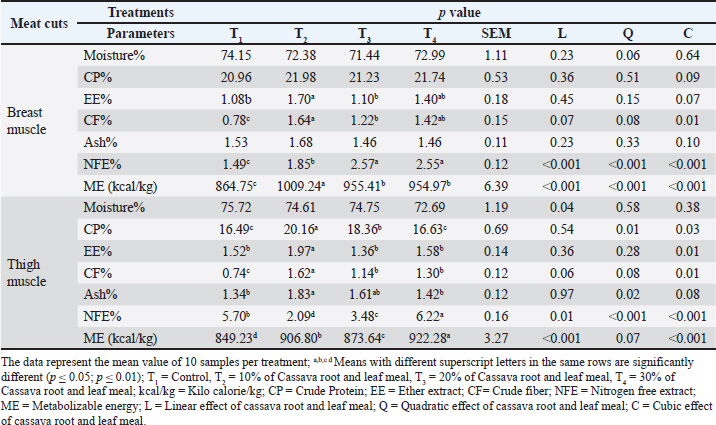 Proximate composition of meatThe proximate composition of both breast and thigh meat varied across treatments. In breast meat, T2 recorded the highest CP (21.98%) and ether extract (1.70%), alongside significantly higher ME (1009.24 kcal/kg), suggesting improved nutrient deposition. Similarly, the thigh muscle in T2 exhibited enhanced CP (20.16%), EE (1.97%), and ME (906.80 kcal/kg), outperforming the control group. Although moisture and ash content remained statistically similar among groups, crude fiber and NFE content varied notably, with T2 presenting a favorable nutrient profile for meat quality and consumer preference (Table 4). Table 4. Proximate composition of breast and thigh muscle of broiler on graded levels of experimental diets of cassava root and leaf meal at the age of 35 days.