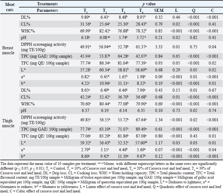 Meat quality attributesMeat quality parameters were significantly influenced by cassava inclusion levels. In the breast muscle, DL was lowest in T2 (6.43%) compared to T1 (9.89%), T3 (8.48%), and T4 (8.95%). CL also decreased in T2 (25.64%) and T3 (25.30%), while higher values were seen in T1 (31.56%) and T4 (28.43%). WHC peaked in T2 (82.42%), followed by T4 (78.32%) and T3 (76.88%), with T1 showing the lowest (69.99%). Breast muscle pH was highest in T1 (6.18), followed by T2 (6.08), while T3 (5.74) and T4 (5.72) were lower. Antioxidant indicators such as DPPH were highest in T4 (61.37 mg TE/100g), with T2 at 56.94 mg, and lowest in T1 (49.91 mg). Total phenolic content (TPC) was highest in T3 (64.28 mg GAE/100g), while total flavonoid content (TFC) was greatest in T2 (86.34 mg QE/100g). Color lightness (L*) was highest in T2 (60.34); a* was lowest in T2 (0.45) and highest in T4 (1.98); b* peaked in T3 (11.11). In the thigh muscle, T2 showed the lowest DL (6.49%) and CL (32.42%), with the highest WHC (80.44%). DPPH and TFC were highest in T4 (67.64 mg TE and 87.08 mg QE/100g), while TPC also peaked in T4 (89.49 mg GAE/100g). Lightness was highest in T1 (59.32), a* in T4 (5.69), and b* in T3 (11.39) (Table 5). Table 5. Quality attributes of breast and thigh muscle of broiler on graded levels of experimental diets of cassava root and leaf meal at the age of 35 days.