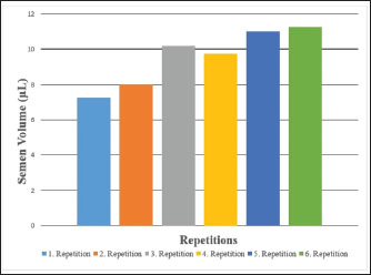Fig. 2. Semen volume values of Carrier pigeons for each repetition between May and October.