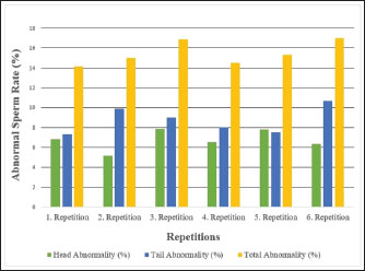 Fig. 6. Abnormal sperm rates of Carrier pigeons for each repetition between May and October. Table 1. Spermatological characteristics and descriptive statistics of Carrier pigeons.