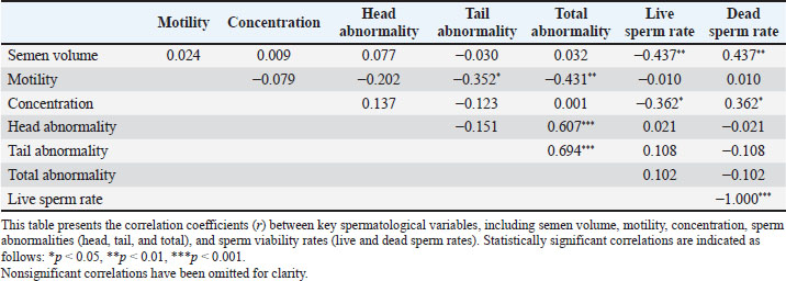 Correlation analyses among spermatological parameters revealed several statistically significant associations (Table 2). Semen volume was significantly negatively correlated with live sperm rate (r=−0.437, p < 0.01) and positively correlated with dead sperm rate (r=0.437, p < 0.01). Motility was negatively correlated with total abnormality (r=−0.352, p < 0.05) and live sperm rate (r=−0.431, p < 0.01), indicating that higher motility is associated with lower abnormality and a higher proportion of live sperm. In addition, motility demonstrated a weak, non-significant negative correlation with tail and head abnormalities. Semen concentration was significantly negatively correlated with dead sperm rate (r=−0.362, p < 0.05) and positively correlated with live sperm rate (r=0.362, p < 0.05). A strong positive correlation was observed between head and tail abnormalities (r=0.694, p < 0.001) and between head and total abnormalities (r=0.607, p < 0.001). Live sperm rate was perfectly and negatively correlated with dead sperm rate (r=−1.000, p < 0.001). Table 2. Pearson correlation coefficients among spermatological parameters in Carrier pigeons.