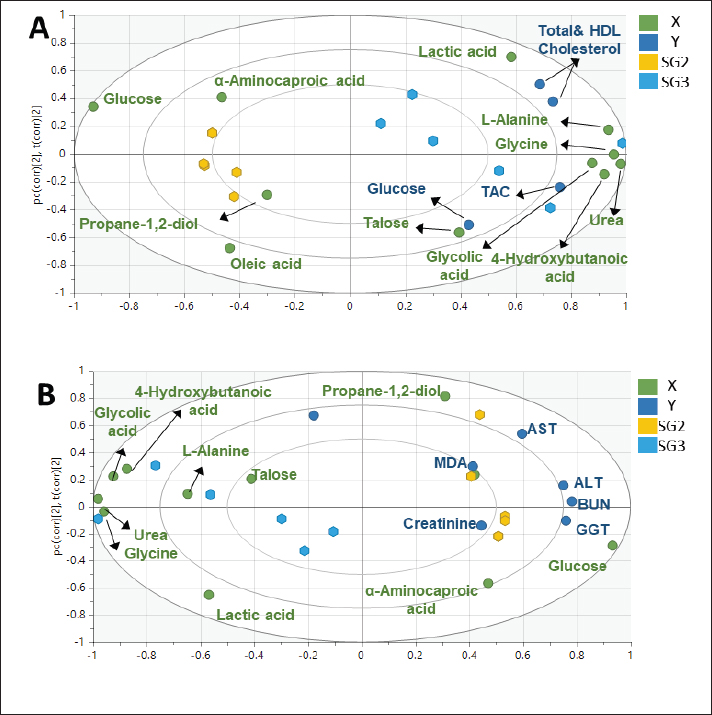 Fig. 2. Two PLS biplots (A and B) correlating therapeutic approaches (SG2, red dots and SG3, violet dots) based on their GC-MS-derived metabolite profiles (X-variables) correlated to the elevated biochemical parameters due to pneumonic condition (TAC, glucose, and total and HDL-cholesterol (Y-variables) and the decreased biochemical parameters due to pneumonic condition as MDA, LDL-cholesterol, creatinine, urea, AST, ALT, and GGT. The derived biplot, (an amalgamation of the information revealed by both the score and loading plots) (Fig. 2) showed that the therapeutic approach relying on a silymarin dose of 280 mg only (SG3) was strongly correlated with the upregulation of TAC, glucose, and total and HDL-cholesterol values as projected close to SG3 samples on the left side of the biplot; however, all of the SG2 samples were remotely distributed on the right side of the biplot. The PLS model (Fig. S1) was initially established by modeling the GC-MS-derived serum metabolite profiles of healthy control (G1) (X-variables) versus pneumonic sheep (G2) to the 12 tested biochemical parameters (Y-variables) to identify endogenous metabolite markers and the biochemical status of each group. The covered variance and prediction power of the model were assessed by R2 and Q2 values, which were computed to be 0.942 and 0.82, respectively, indicating model validity. The PLS score plot (Fig. S1A) showed a clear discrimination between the healthy and pneumonic sheep groups, which was explained by the loading plot (Fig. S1B), which revealed that lactic acid was more elevated in the healthy sheep, whereas urea and creatinine were detected at higher concentrations in the pneumonic sheep. Furthermore, some biochemical parameters were found to be more elevated in the pneumonic sheep group (G2), including liver and kidney functions (AST, ALT, ALT, GGT, creatinine, and urea) as well as oxidative stress, as represented by high MDA values and high LDL-cholesterol. However, TAC, total cholesterol, HDL-cholesterol, and glucose were found at higher concentrations in healthy sheep than in pneumonic sheep. DiscussionThe symptoms observed in Group 2 were previously recorded by Hassan et al. (2019). Microbial resistance to antibiotic administration could be responsible for the higher body temperature and respiratory and pulse rates observed in SG1 (Hassan et al., 2024), whereas SG2–SG4 did not significantly differ from G1. The rapid clinical response to treatment with a high dose of oral silymarin (560 mg) in SG4 could be attributed to its broad-spectrum activity as an anti-inflammatory, anti-oxidative, and antimicrobial agent against Pseudomonas aeruginosa, Staphylococcus aureus, Escherichia coli, and Mycoplasma ovipneumoniae (Ou et al., 2018; Hassan et al., 2024). The higher AST, ALT, GGT, creatinine, and urea concentrations recorded in pneumonic sheep have been previously reported (Hassan et al., 2019; Saeed et al., 2021; Arbaga et al., 2022). Although these biochemical parameters are not specific markers for pneumonia, their increase likely reflects the systemic impact of infection, oxidative stress, and inflammatory mediators that can impair hepatic and renal function (Aytekin et al., 2011). Higher creatinine and urea concentrations could be related to renal damage caused by the excessive release of free radicals exhibited during the inflammatory progression and enhanced protein catabolism (Saleh and Allam, 2014). Interestingly, silymarin treatment improved liver and kidney functions in pneumonic sheep compared with traditional treatment. Our findings were similar to those of previous studies (Saller et al., 2007). It is plausible that silymarin has anti-inflammatory and antioxidant properties that protect against cellular injury (Habib-ur-Rehman et al., 2009; Metwally et al., 2009; Andrade and Tulkens, 2011). Pneumonic sheep had significantly higher triglyceride and LDL-cholesterol levels and lower cholesterol, HDL-cholesterol, and glucose concentrations than healthy sheep. Previous studies have reported similar findings (El-Deeb and Tharwat, 2015). Inflammation can cause hypertriglyceridemia in both humans and animals (Phetteplace et al., 2000). The lower serum cholesterol concentrations in the sheep in this study could have been due to liver injury with subsequent changes to lipoprotein metabolism (El-Deeb and Elmoslemany, 2016). Pneumonic sheep that received silymarin had significantly lower triglyceride and LDL-cholesterol and higher cholesterol, HDL cholesterol, and glucose concentrations. Potential explanations include that silymarin could decrease blood cholesterol concentration by slowing down liver cell cholesterol synthesis and speeding up cholesterol conversion to other molecules ( Huseini et al., 2004). The binding of low-density LDL is also normalized by silymarin (Khazaei et al., 2022). The significant increase in HDL-cholesterol may be due to reduced cholesterol absorption in pneumonic sheep receiving silymarin in the treatment protocol (Sobolová et al., 2006). Furthermore, the differential therapeutic efficacy of the experimental therapeutic approaches on restoring the normal biochemical parameters in pneumonic sheep was demonstrated by the employed supervised pattern recognition approach. One potential explanation is that silymarin could decrease blood cholesterol concentration by slowing down liver cell cholesterol synthesis and speeding up the conversion of cholesterol to other molecules (Tamminen et al., 2018). In addition, silymarin normalizes the binding of LDL (Sobolová et al., 2006). The significant increase in HDL-C may be due to reduced cholesterol absorption in pneumonic sheep receiving silymarin in the treatment protocol (Khazaei et al., 2022). In the current study, pneumonic sheep had significantly higher MDA and lower TAC concentrations than healthy sheep, similar to the results reported by Hassan et al. (2019). The increase in serum MDA concentrations could be due to excessive lipi