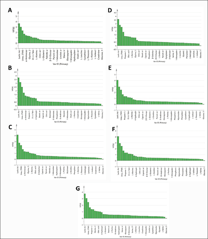 Fig. S3. VIP plots (A–G) obtained from the PLS models in Figure 1A–G.