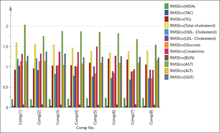 Fig. S6. Root mean square errors of cross-validation (RMSEcv) of the PLS models shown in Figures S4 and S5 for all the tested biochemical parameters as TAC, total cholesterol, HDL-cholesterol, blood glucose concentrations, MDA, TG, LDL-cholesterol, creatinine, urea, blood serum AST, ALT, and GGT. | ||