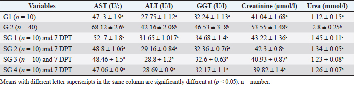 Effect of traditional treatment and/or silymarin on liver and kidney function testsPneumonic sheep had significantly higher AST, ALT, GGT, creatinine, and urea concentrations than healthy sheep (p < 0.05; Table 2). At 7 DPT, SGs 2, 3, and 4 did not differ significantly from healthy sheep (p > 0.05; Table 2), except for SG2, which revealed significantly higher creatinine and urea concentrations than healthy sheep (p < 0.05; Table 2), whereas SG 1 showed increased AST, ALT, creatinine, and urea concentrations than healthy sheep (p < 0.05; Table 2). Table 2. Effect of traditional and/or silymarin on hepatic and renal function tests.