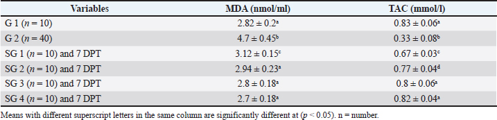 Effect of traditional treatment and/or silymarin on oxidant and antioxidant statusPneumonic sheep had significantly higher MDA and lower TAC concentrations than healthy sheep (p < 0.05; Table 4). For MDA concentrations at 7 DPT, SGs 2, 3, and 4 were not significantly different from healthy sheep (p > 0.05), whereas SG1 showed higher concentrations than healthy sheep (p < 0.05). For TAC concentrations at 7 DPT, SG3 and SG4 were not significantly different from healthy sheep (p > 0.05), whereas SG1 and SG2 had lower TAC concentrations than healthy sheep (p < 0.05; Table 4). Table 4. Effect of traditional treatment and silymarin on oxidative and antioxidant status.